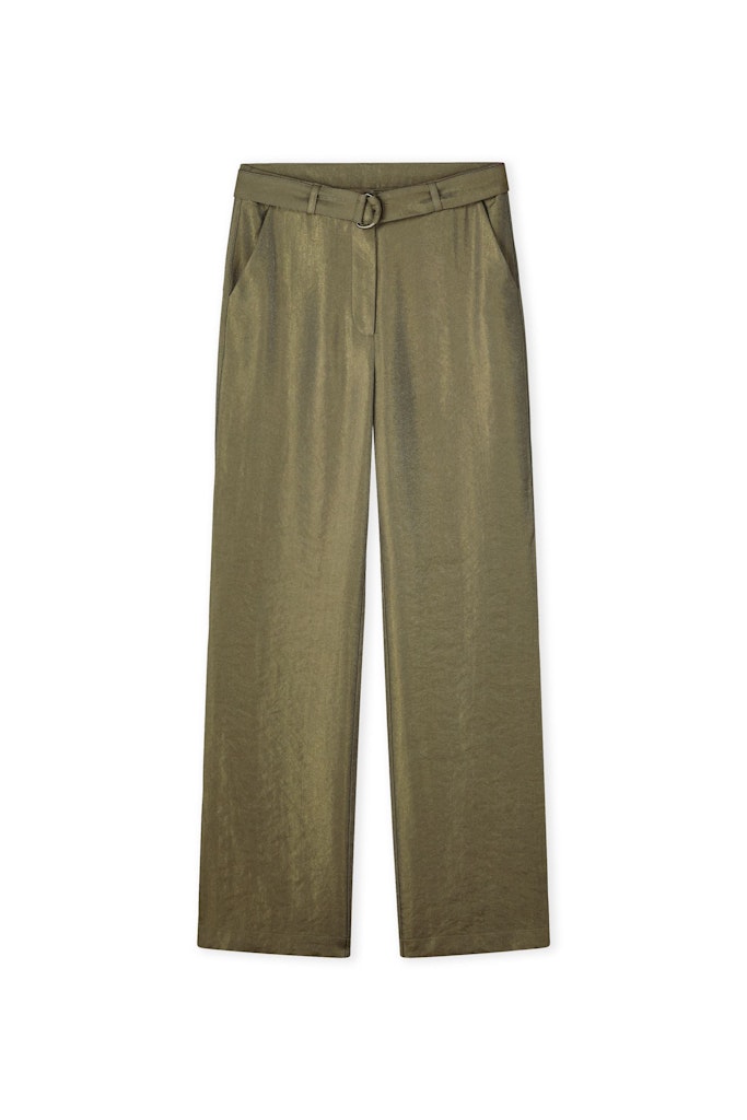 Glanzende broek van Kyra met rechte pijpen, knoop- en ritssluiting, twee steekzakken en een ceintuur in de taille.