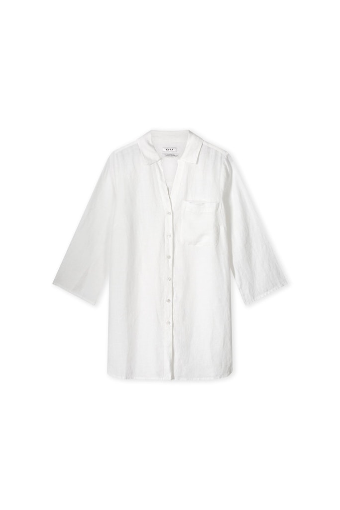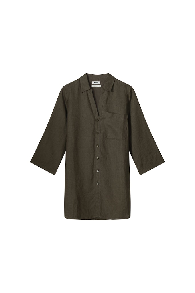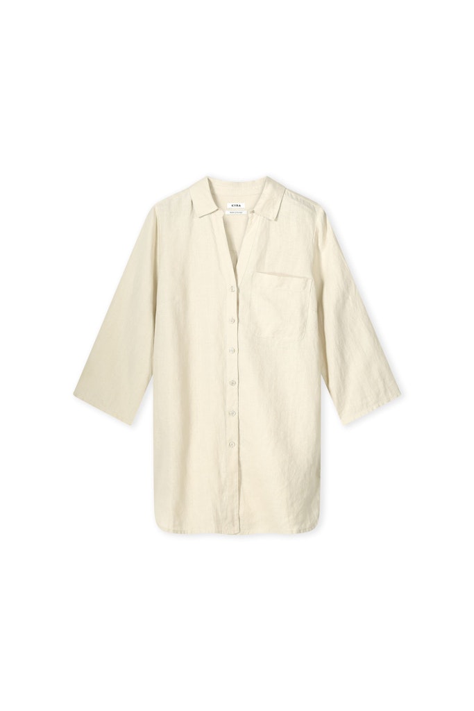 Linnen blouse van Kyra met driekwart mouwen, kraag, V-hals, knoopsluiting en een opgestikte borstzak. Materiaal: linnen 100%