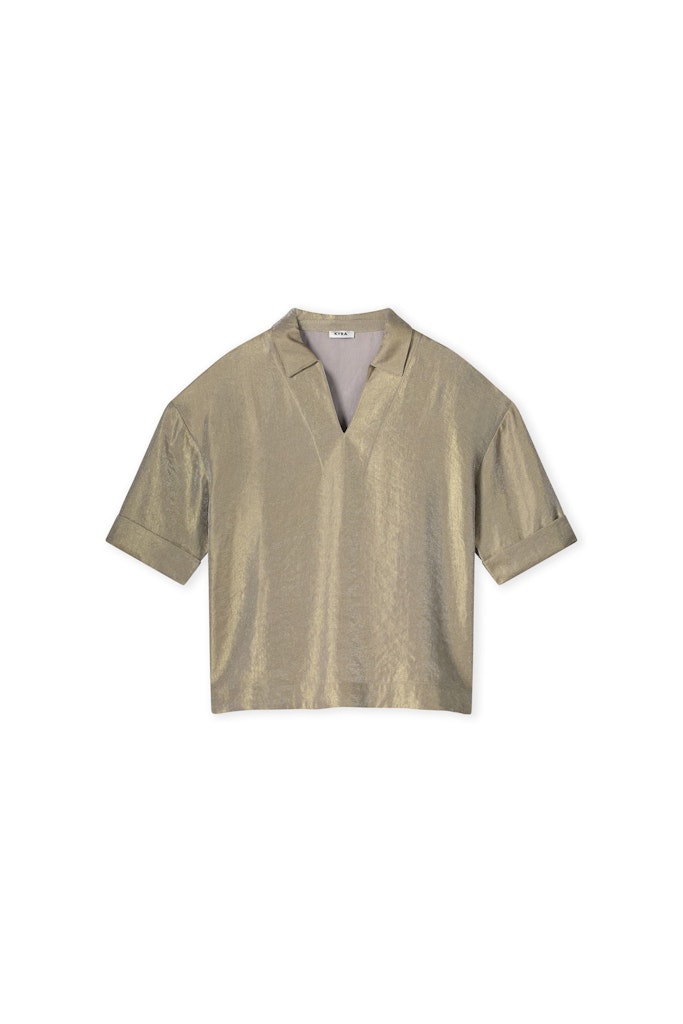 Glanzende blouse van Kyra met korte mouwen voorzien van omslag, kraag en een V-hals. Materiaal: Viscose 82%| polyetheen 12%| polyamide 6%