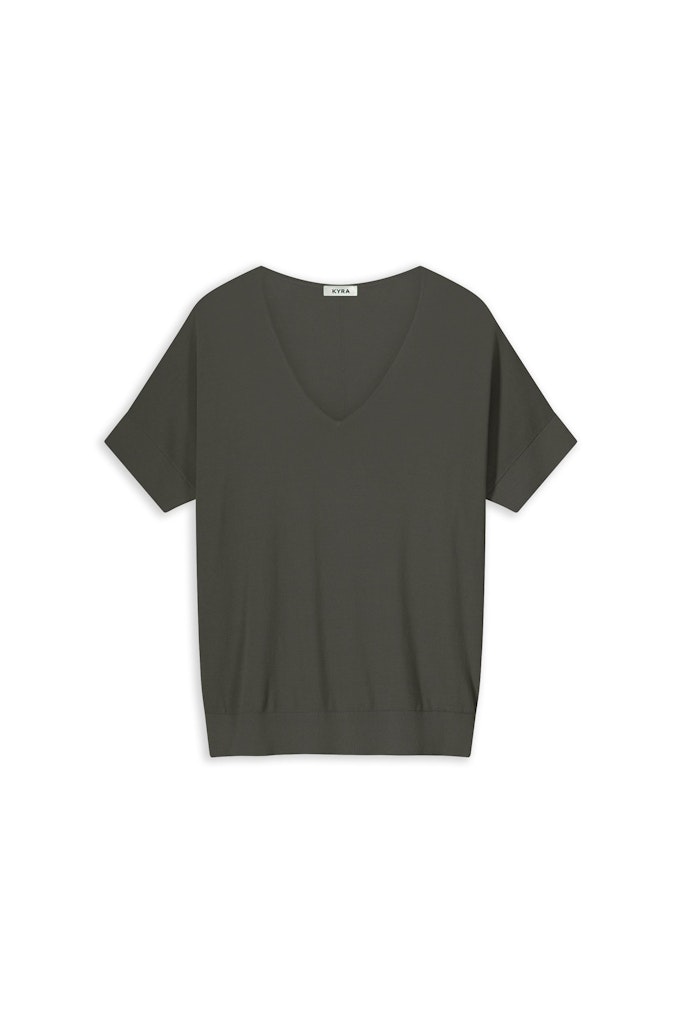 Trui van Kyra met korte mouwen, V-hals en ribgebreide boorden. Materiaal: Katoen 100%