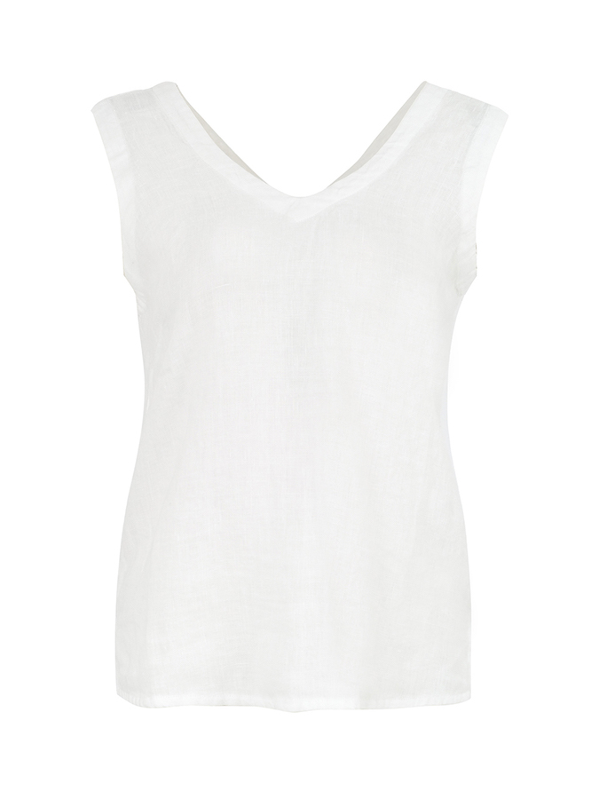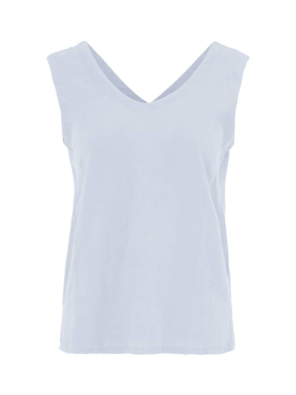Mouwloze linnen top van Dolcezza met een ronde hals aan de voorzijde, V-hals en een knoopsluiting aan de achterzijde en een korte split in de zijnaden. Materiaal: Linnen 100%