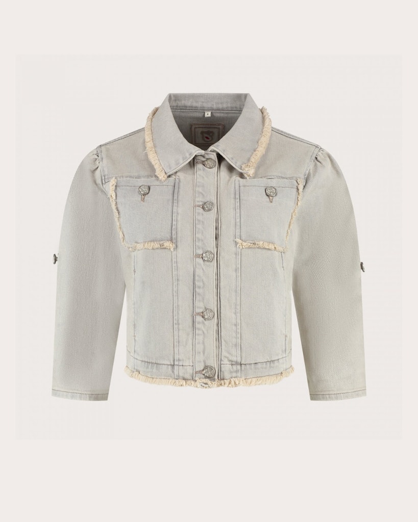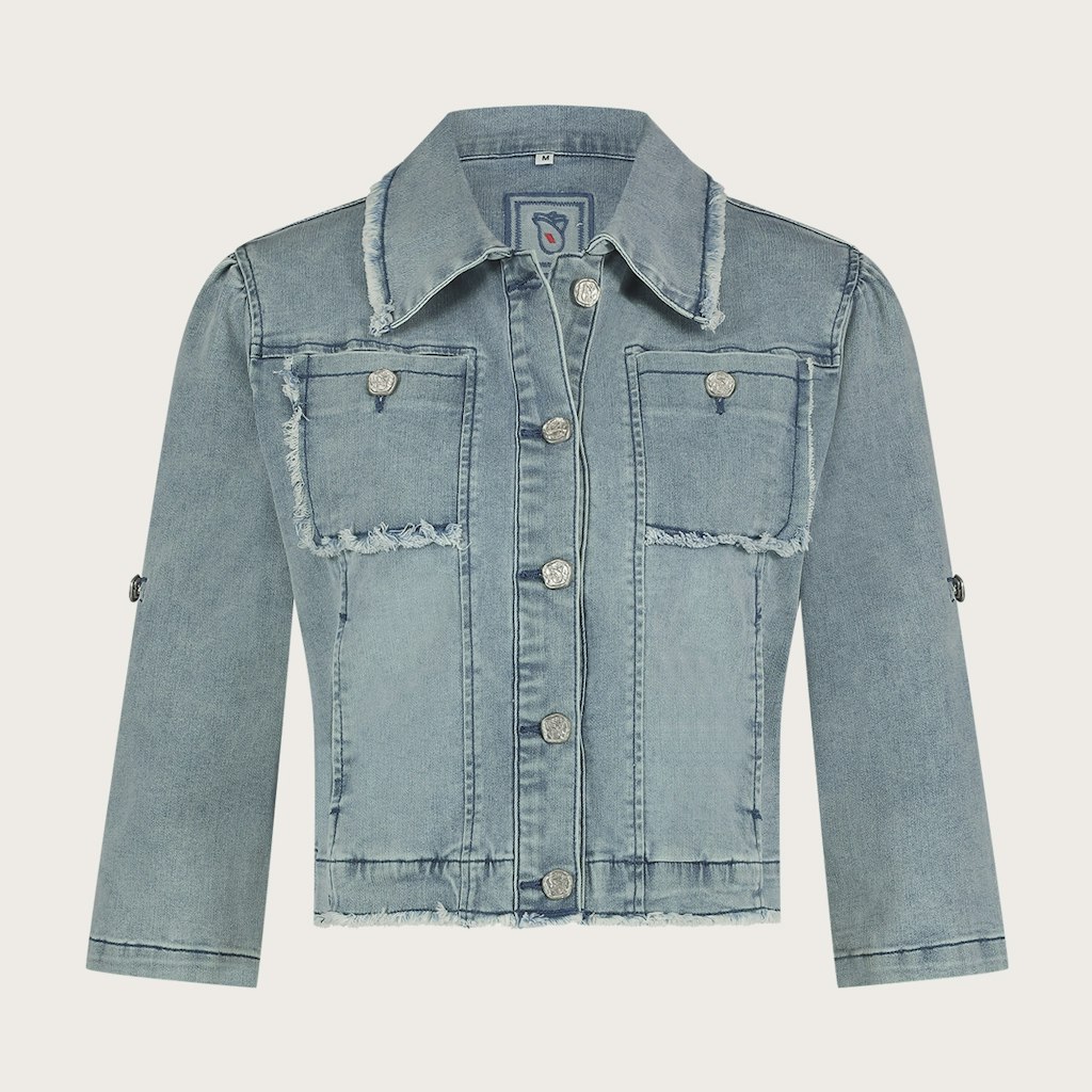 Denim jacket van Florez met driekwart hold-up mouwen, kraag, knoopsluiting, steekzakken, opgestikte borstzakken en gerafelde randen.