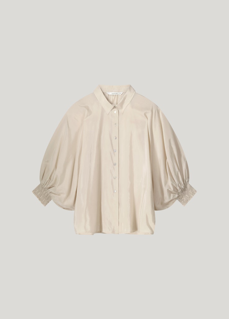Glanzende blouse van Summum met driekwart vleermuismouwen voorzien van gesmokte manchetten kraag en een knoopsluiting. Materiaal: Katoen 62%| viscose 38%