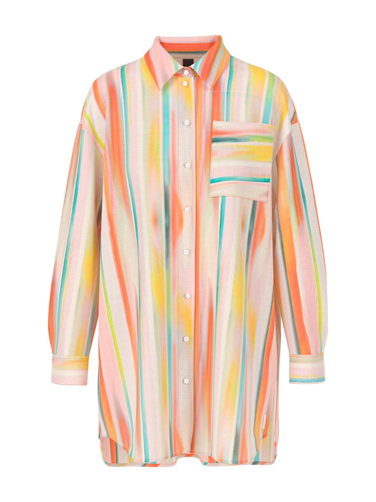 Semi-transparante blouse van Marc Cain Sports in een gestreept dessin met lange mouwen, kraag, knoopsluiting, opgestikte borstzak en een afgeronde zoom.