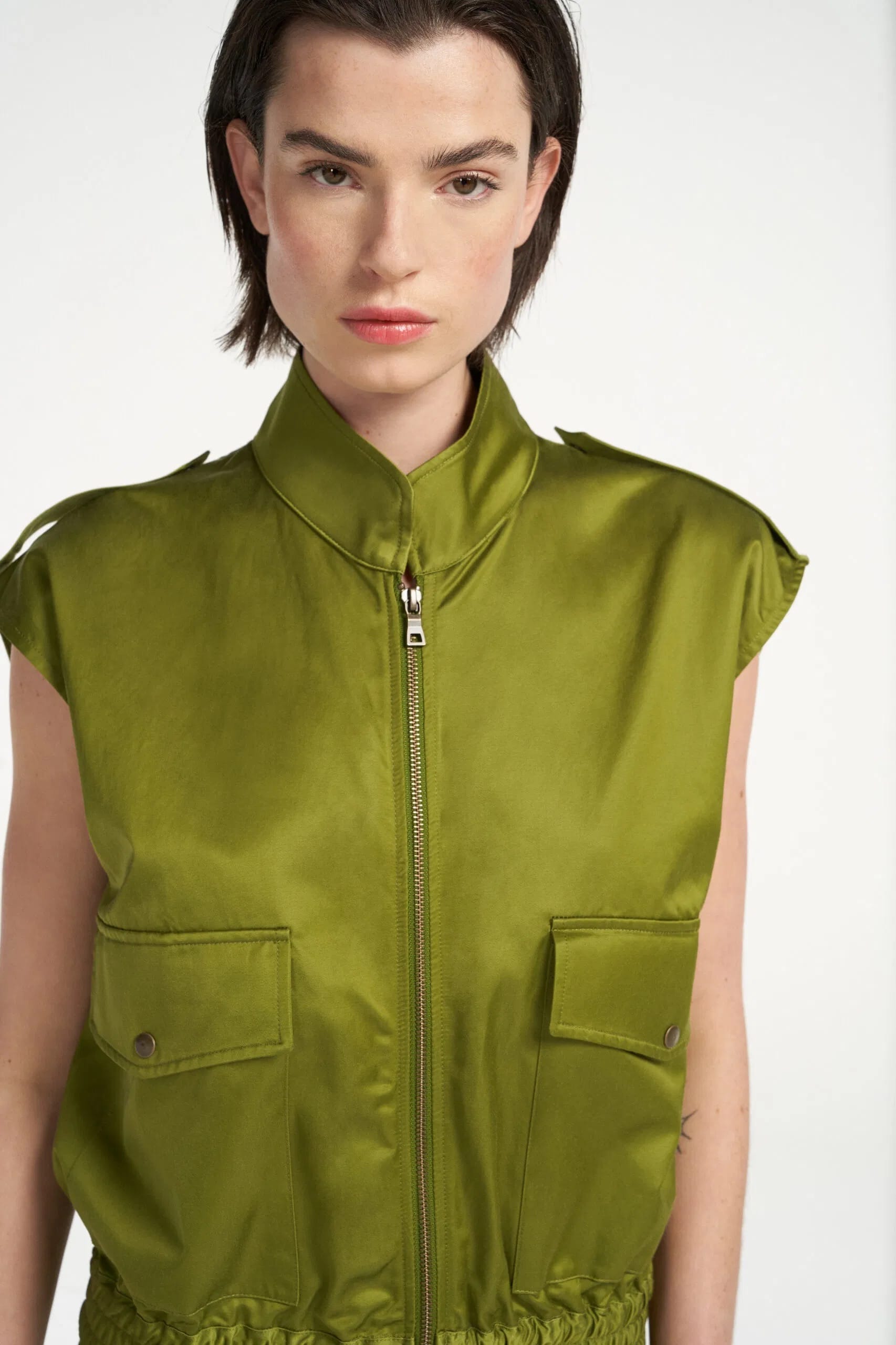 Gilet van Femmes du Sud in een licht glanzende stof met een ritssluiting, elastische tailleband, klepzakken en epauletten op de schouders. Materiaal: Tencel 63%| katoen 32%| linnen 5%