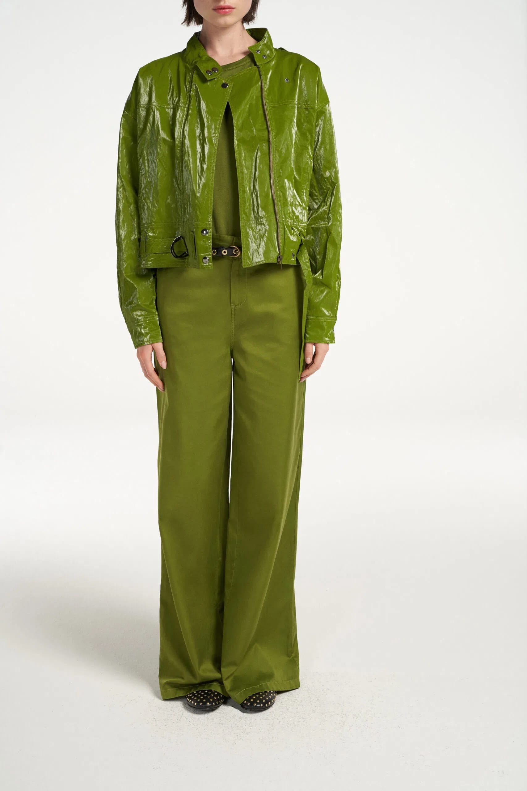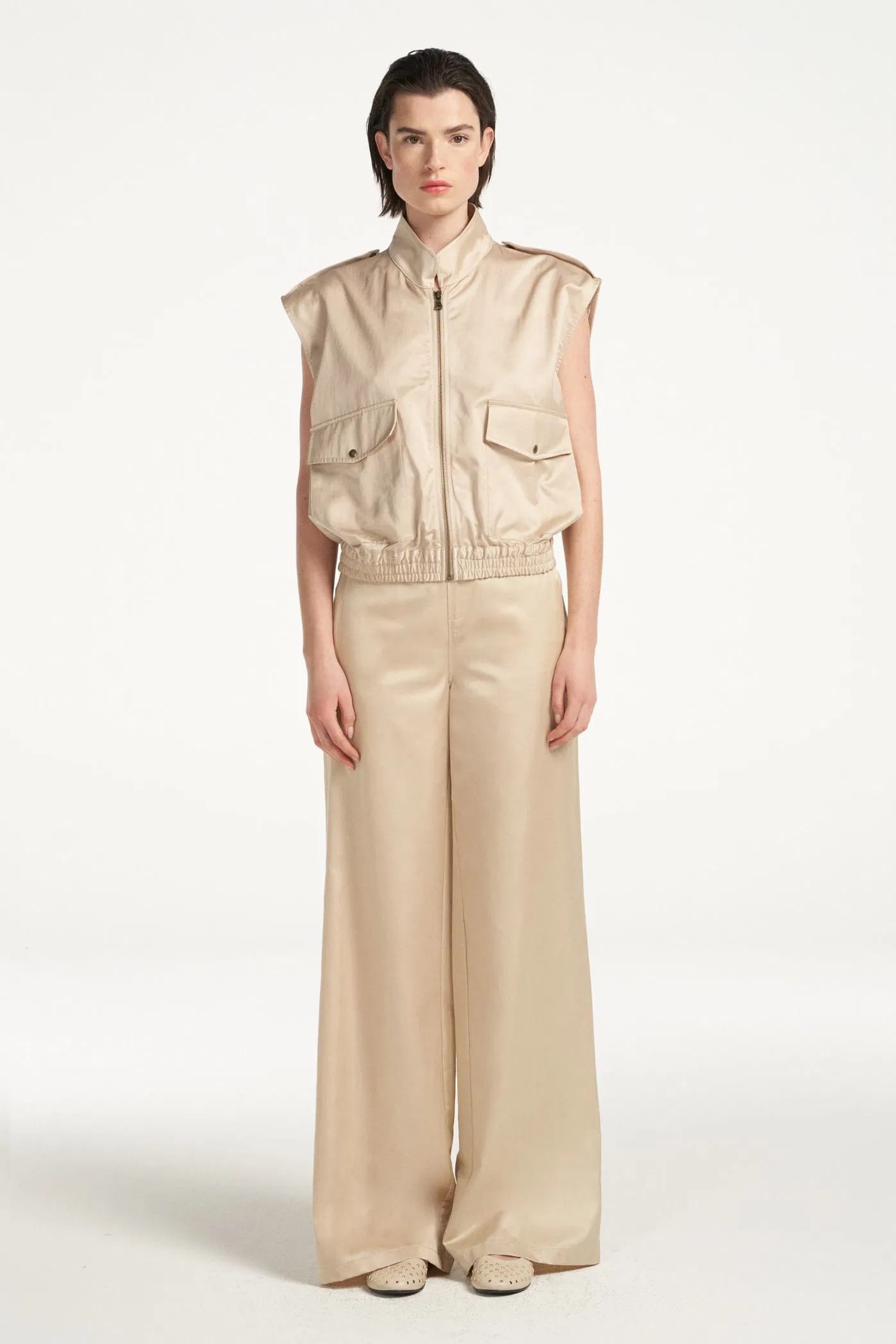 Broek van Femmes du Sud in een licht glanzende stof met wijde pijpen, knoop- en ritssluiting, steekzakken en paspelzakken met knoop aan de achterzijde. Materiaal: Tencel 63%| katoen 32%| linnen 5%