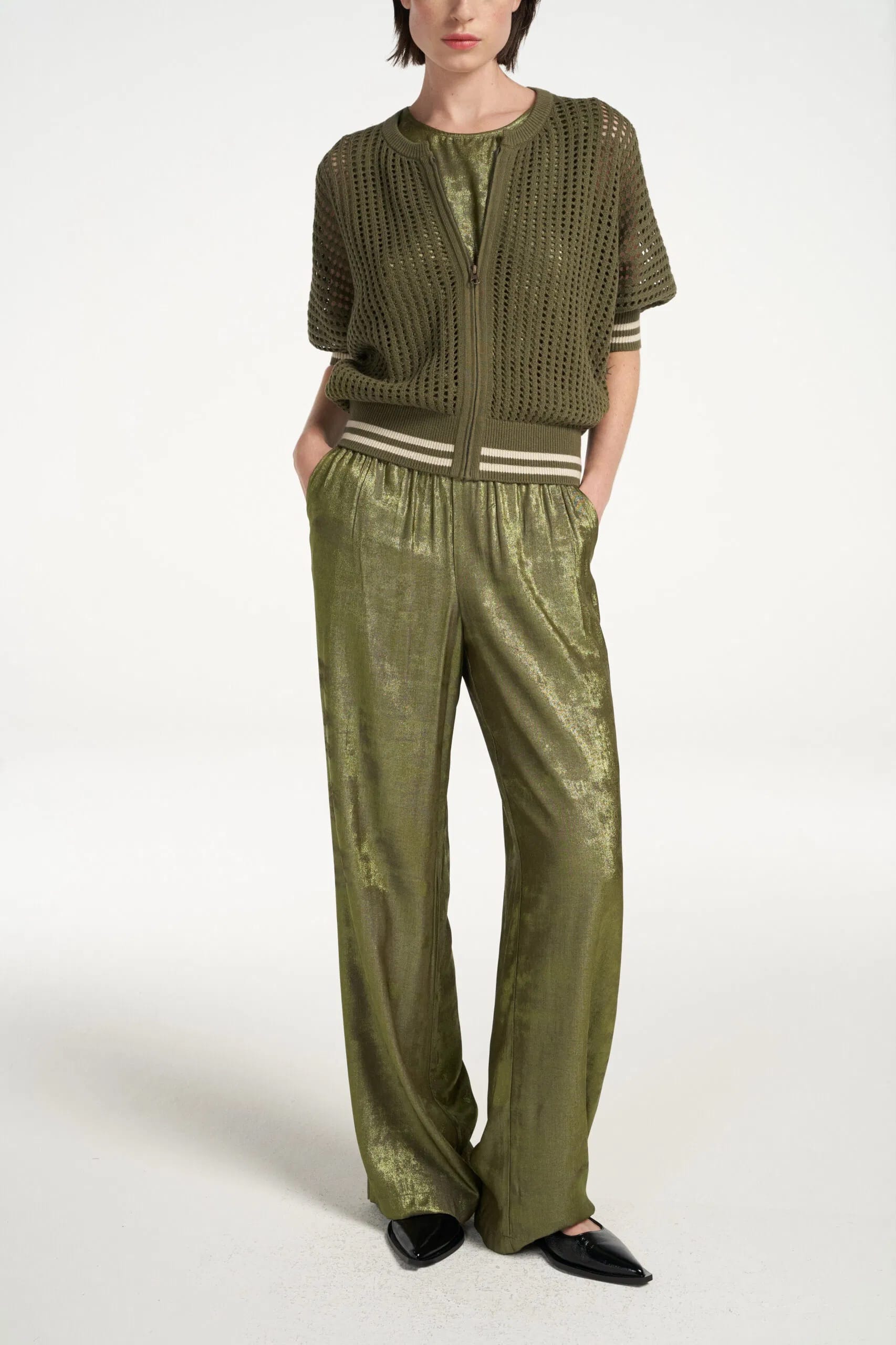 Glimmende broek van Femmes du Sud met wijde pijpen, elastische tailleband, steekzakken en paspelzakken met knoop aan de achterzijde.