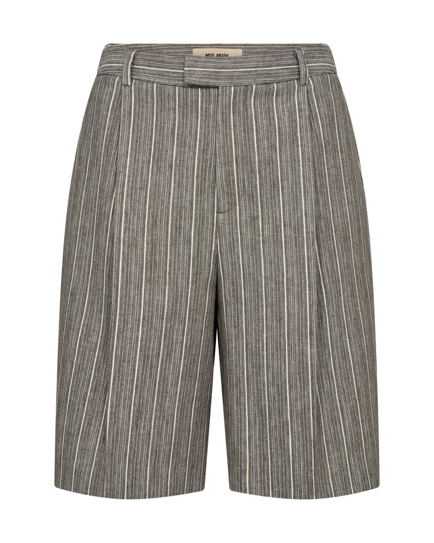 Gestreepte bermuda van Mos Mosh met een verborgen knoop- en ritssluiting, steekzakken, bandplooien en twee paspelzakken aan de achterzijde. Materiaal: Katoen 53%| polyester 23%| linnen 22%| elastan 2%