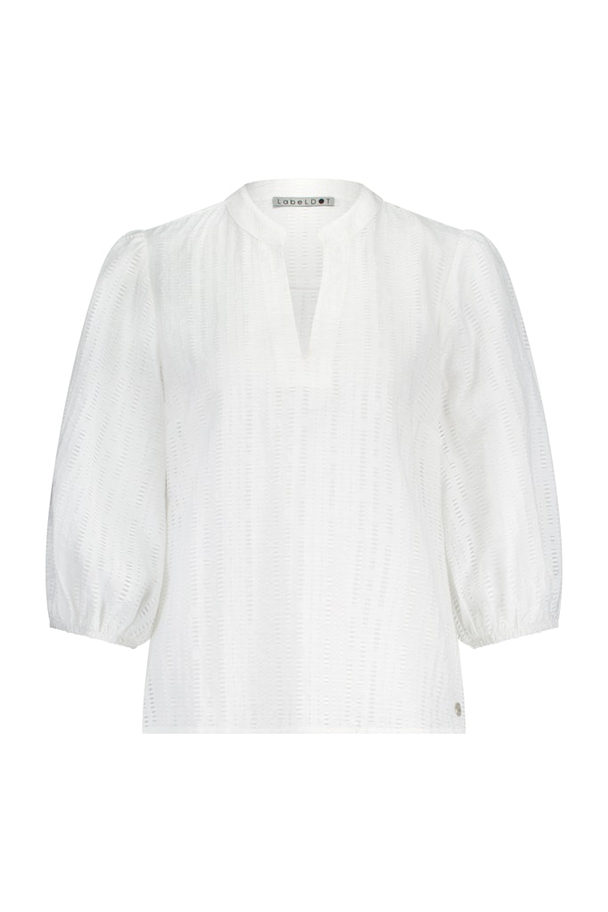 Blouse van Label Dot in een structuur dessin met driekwart pofmouwen, lichte opstaande kraag en een V-hals. Materiaal: Eco viscose 77%| polyamide 22%