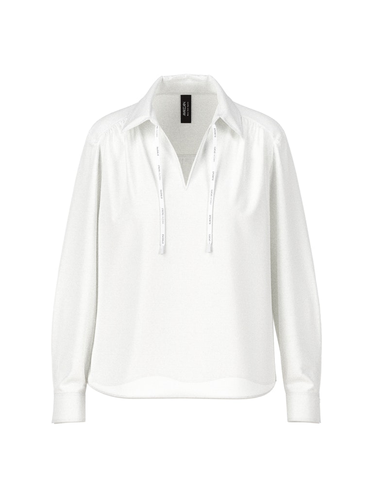 Semi-transparante blouse van Marc Cain Sports met lange mouwen en een kraag voorzien van split en strikkoordjes. Materiaal: Ramee 100%