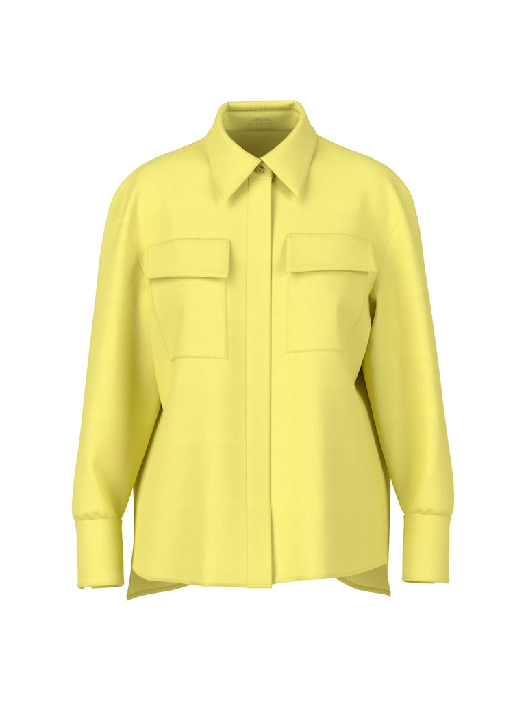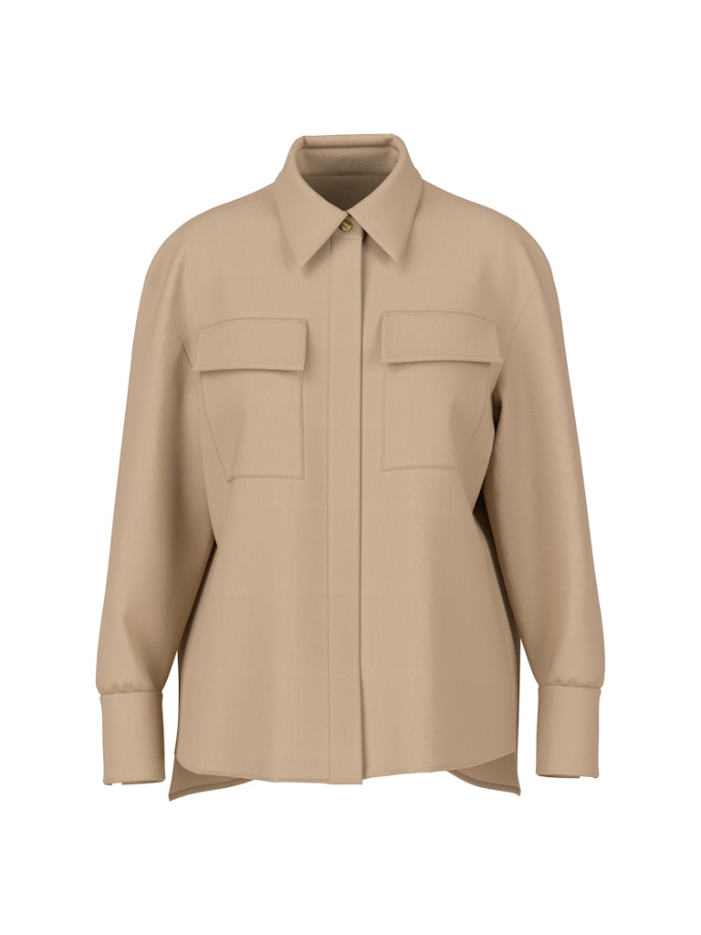 Linnen blouse van Marc Cain met lange mouwen, kraag, verborgen knoopsluiting, twee klepzakken op de borst en een iets langere achterzijde.