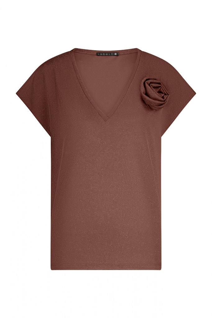 Top van Label Dot voorzien van lurex draadje met een afneembare bloem-broche, korte aangeknipte mouwen en een V-hals. Materiaal: Polyester 80%| lurex 15%| elastan 5%