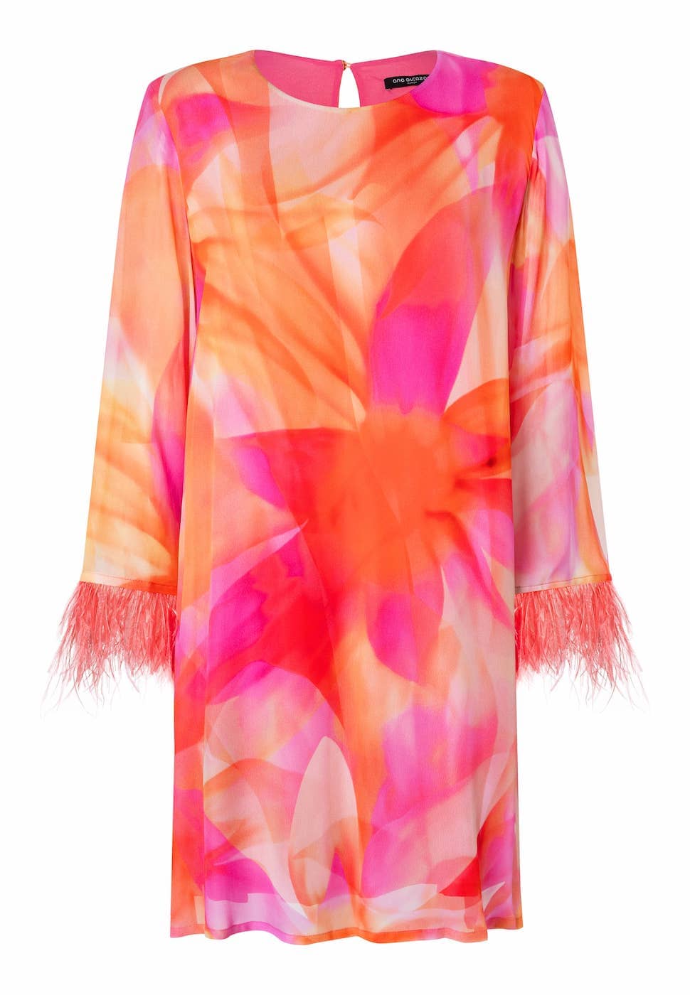 Chiffon jurk van Ana Alcazar in een all-over dessin met lange mouwen voorzien van veertjes aan de manchetten, ronde hals en een keyhole met knoopsluiting aan de achterzijde.