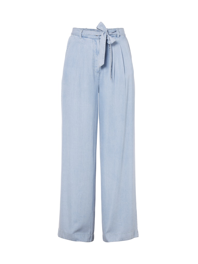 Broek van Beaumont met wijde pijpen, knoop- en ritssluiting, steekzakken, paspelzakken en een elastische tailleband aan de achterzijde en een strikceintuur in de taille.