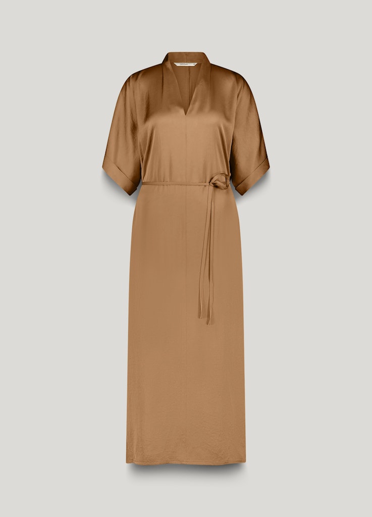 Soepelvallende jurk van Summum met korte aangeknipte mouwen voorzien van omslag, V-hals, steekzakken, plooien op de rug, split in de zijnaden en een strikceintuur in de taille. Materiaal: Acetaat 100%
