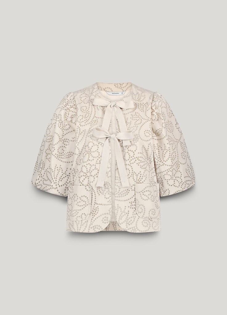 Blouse/jasje van Summum in een gaatjes patroon met halflange ballonmouwen, gevoerd, ronde hals, striksluiting en twee opgestikte zakken.