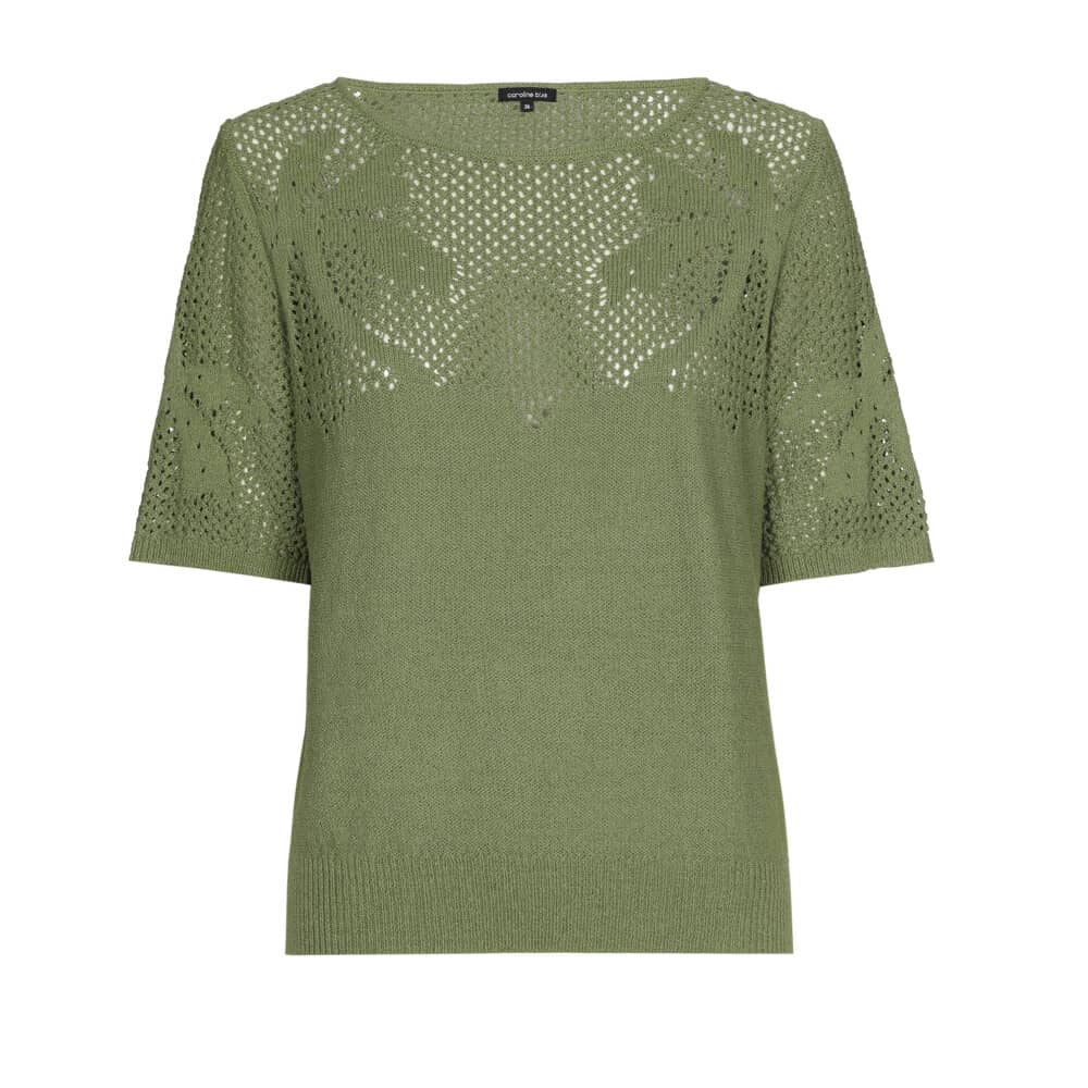 Fijn gebreide trui van Caroline Biss met een halfdoorzichtige palmboom dessin, korte mouwen, brede ronde hals en ribgebreide boorden. Materiaal: Katoen 85%| polyamide 15%