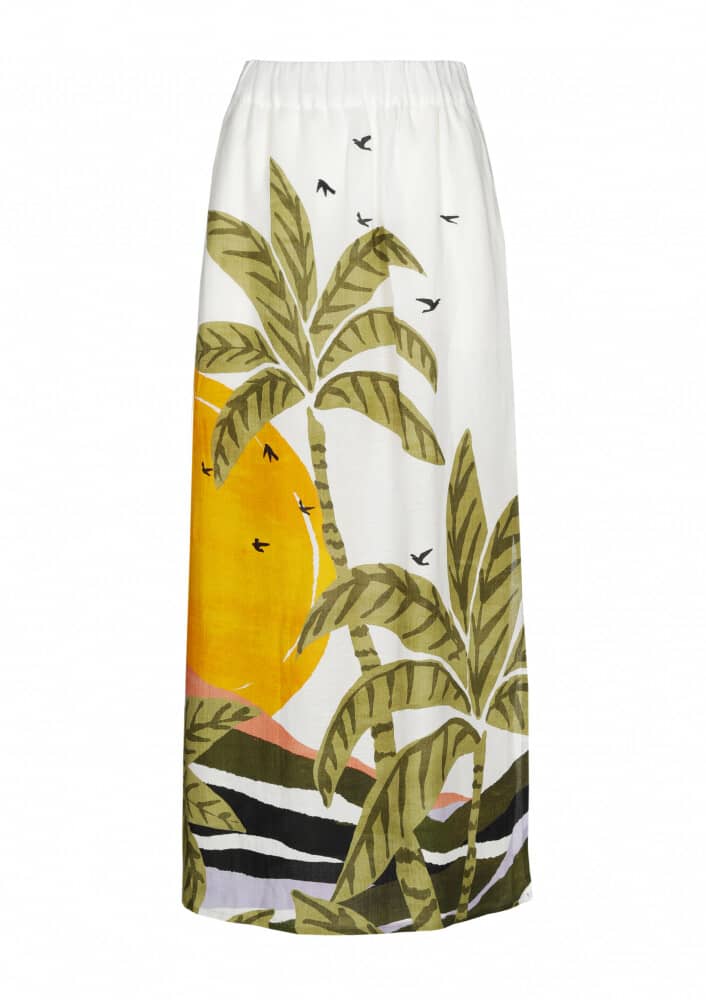 Lange rok van Caroline Biss in een palmboom dessin met steekzakken, hoge split aan de zijnaad en een elastische tailleband.