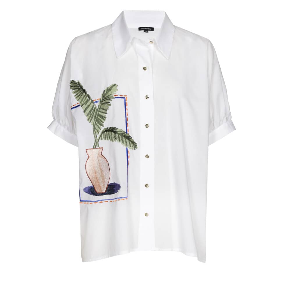 Blouse van Caroline Biss met korte pofmouwen, kraag, knoopsluiting, print aan de voorzijde en een broderie palmboom print aan de achterzijde.
