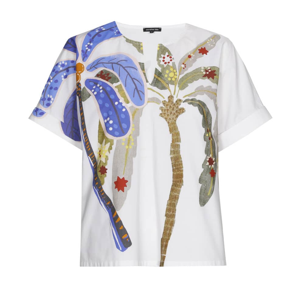 Blouse van Caroline Biss in een palmbomen print met korte aangeknipte mouwen voorzien van omslag en een ronde hals voorzien van V-inkeping.