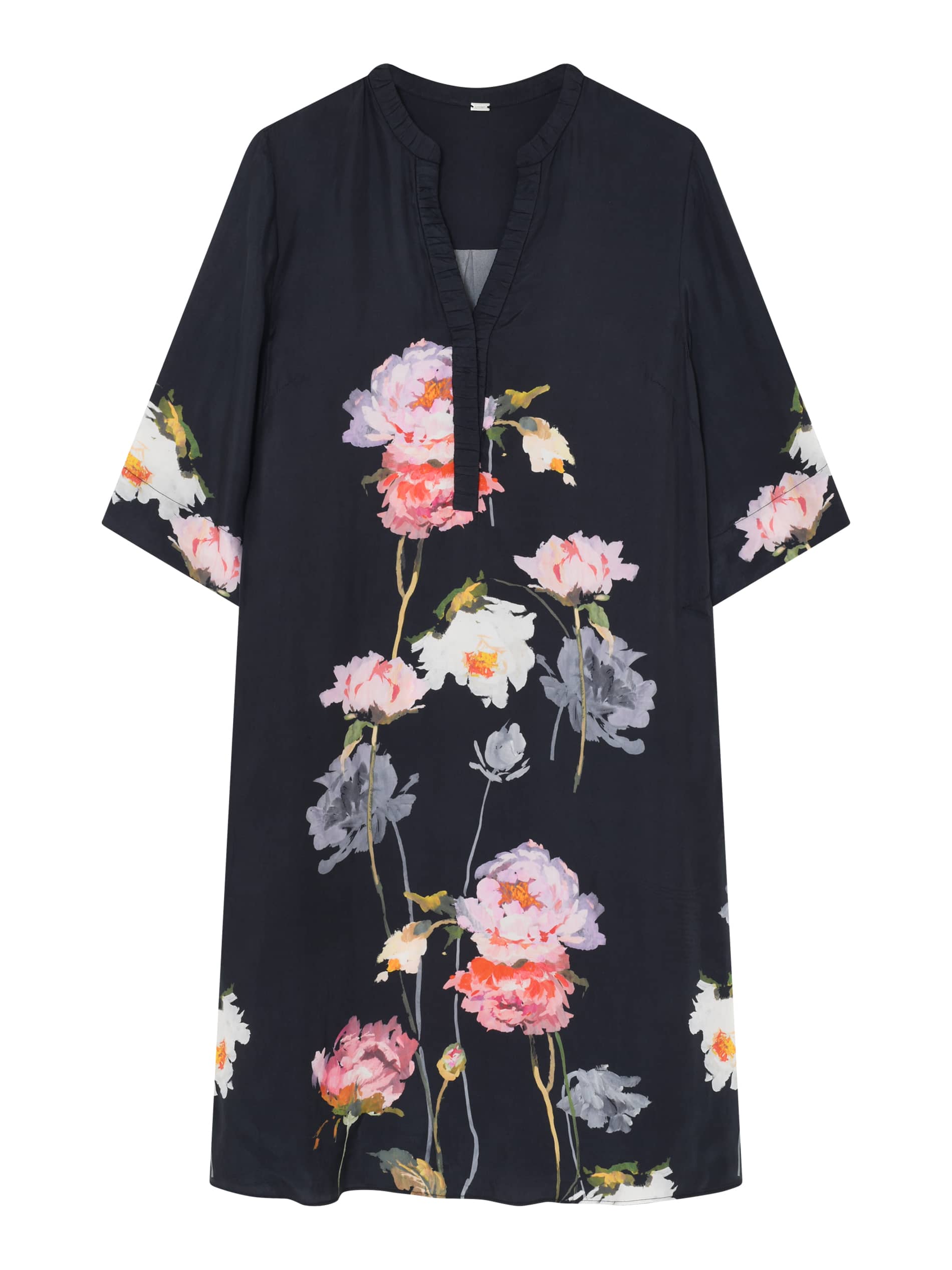 Jurk van Gustav met een bloesem print, driekwart mouwen, V-hals, steekzakken en een doorlopende knoopsluiting.