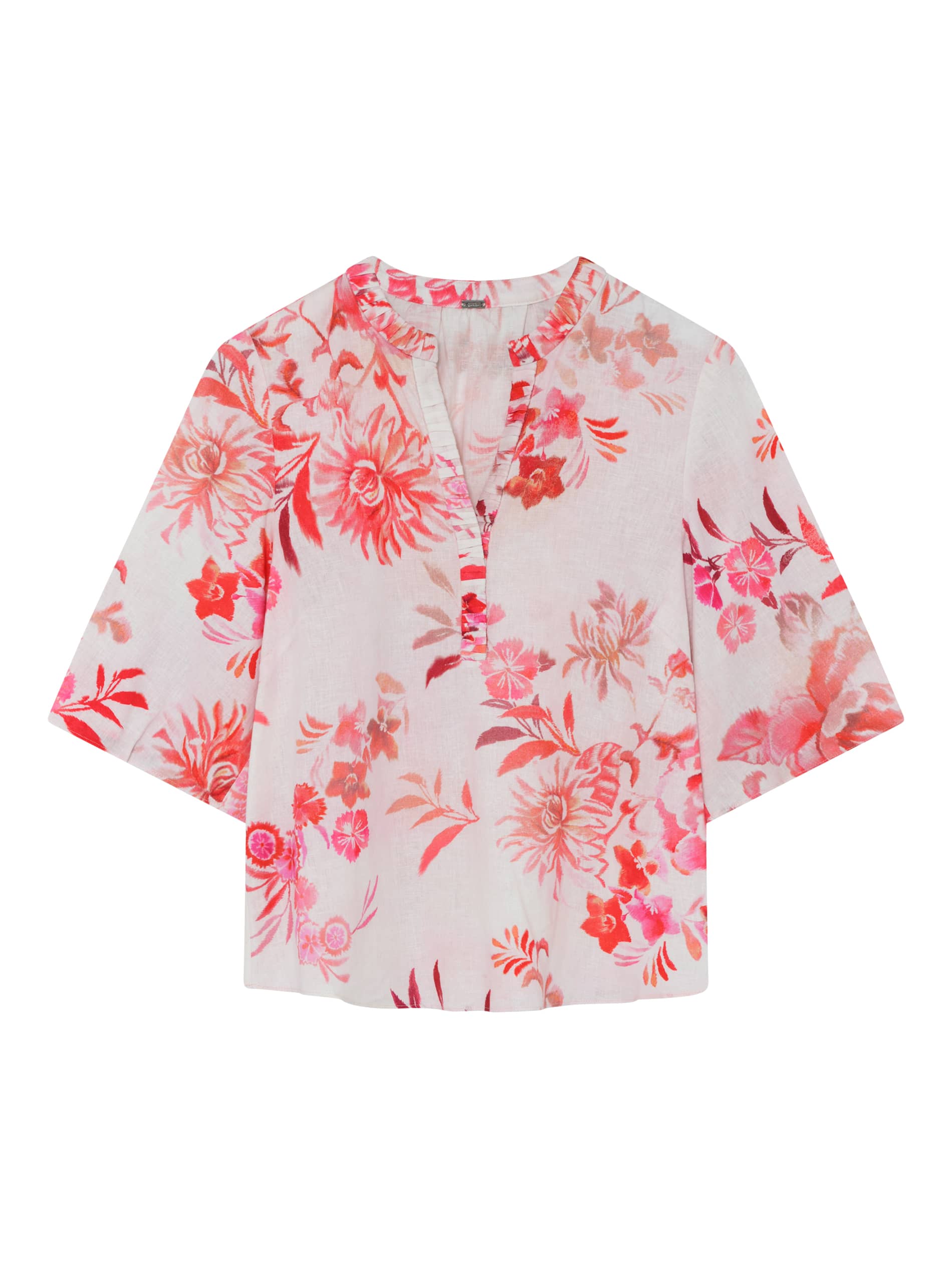Blouse van Gustav in een bloemen dessin met driekwart wijde mouwen en een V-hals voorzien van een korte knoopsluiting.