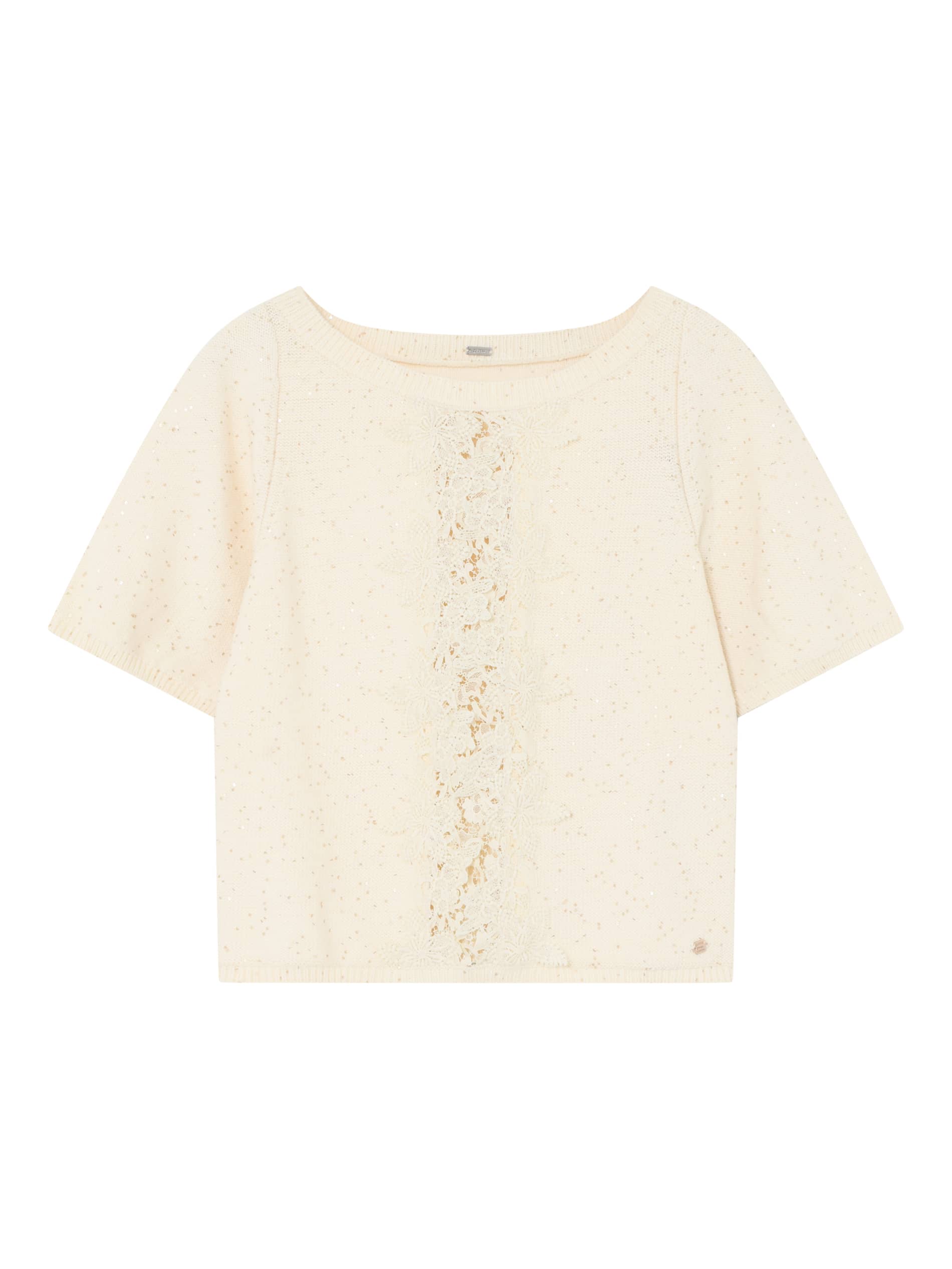 Trui van Gustav voorzien van pailletten en kant met korte raglanmouwen, ronde hals en ribgebreide boorden. Materiaal: Katoen 54%| polyamide 36%| pailletten 10%
