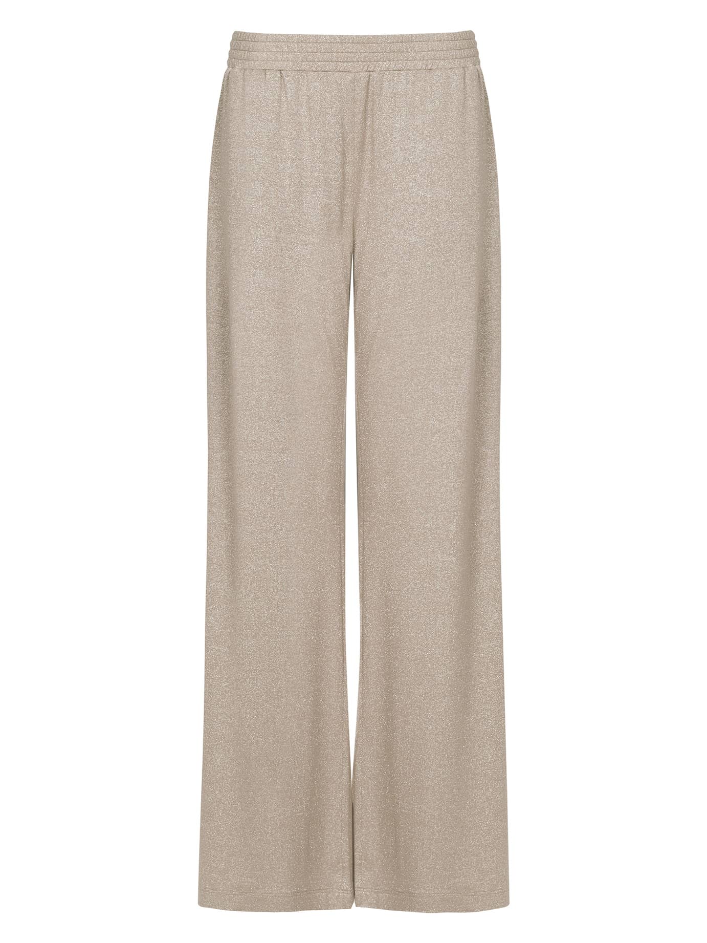 Lurex broek van No Man's Land met wijde pijpen en een elastische tailleband. Materiaal: Viscose 68%| polyester 13%| polyamide 12%| elastan 7%