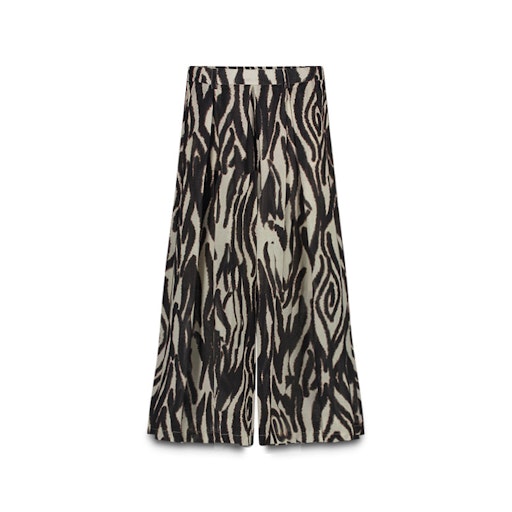 Palazzo broek van Summum in een transparante stof gevoerd tot aan de knie met een zebra dessin, extra wijde pijpen, plooien aan de voorzijde, steekzakken en een elastische tailleband aan de achterzijde.