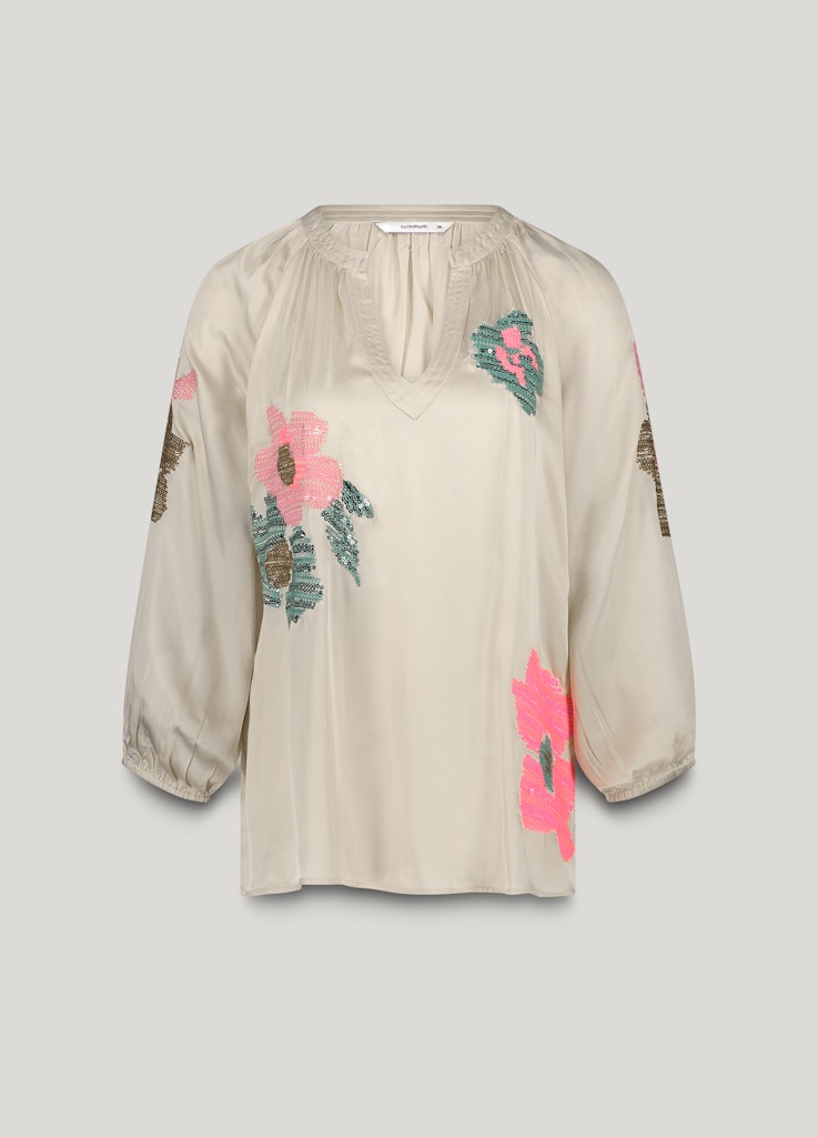 Glanzende A-lijn top van Summum met geborduurde bloemen voorzien van pailletten, driekwart pofmouwen en V-hals. Materiaal: Viscose 100%