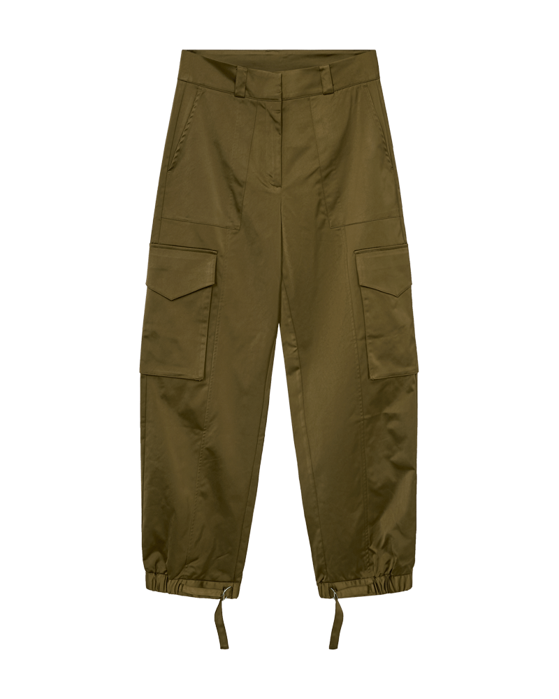 Glanzende cargo broek van Copenhage Muse met taps toelopende pijpen voorzien van bandjes aan de zoom, verborgen knoop- en ritssluiting, opgestikte voorzakken en twee klepzakken aan de zijnaden.