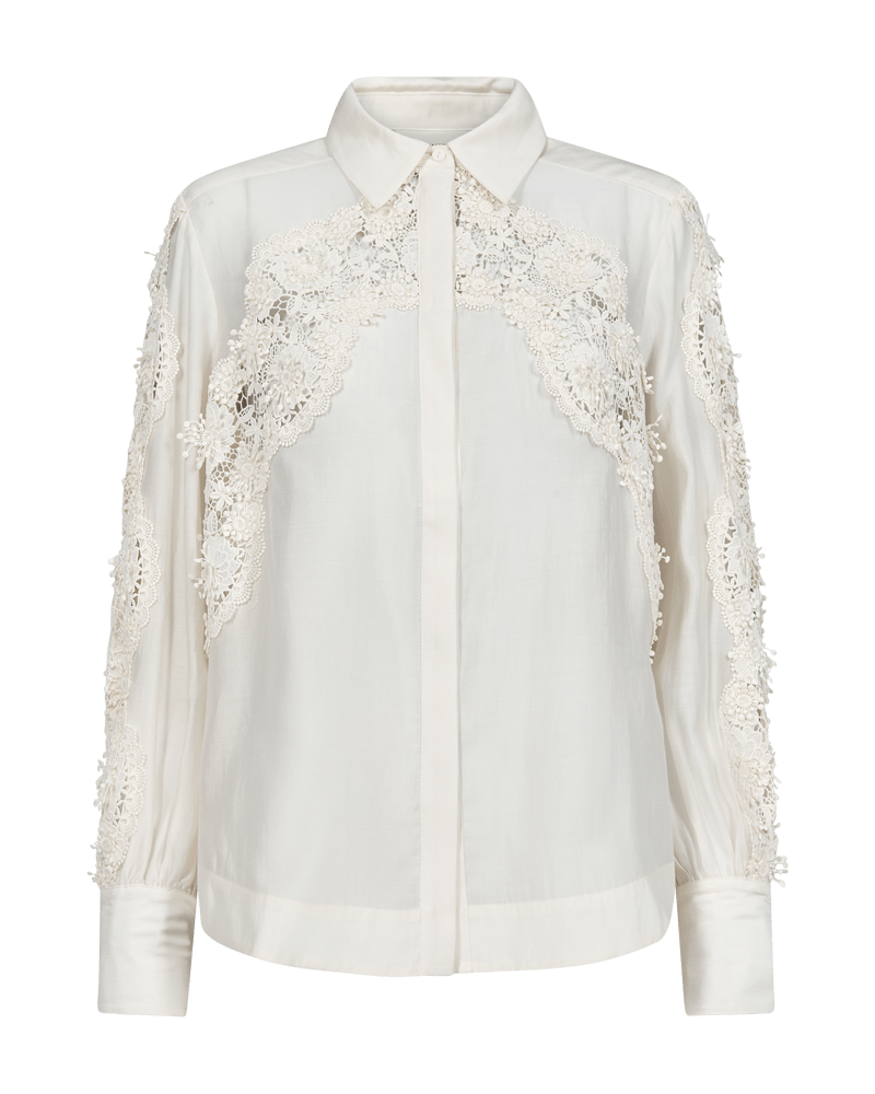 Blouse van Copenhage Muse met kanten details, lange mouwen voorzien van brede manchetten, kraag en een verborgen knoopsluiting.