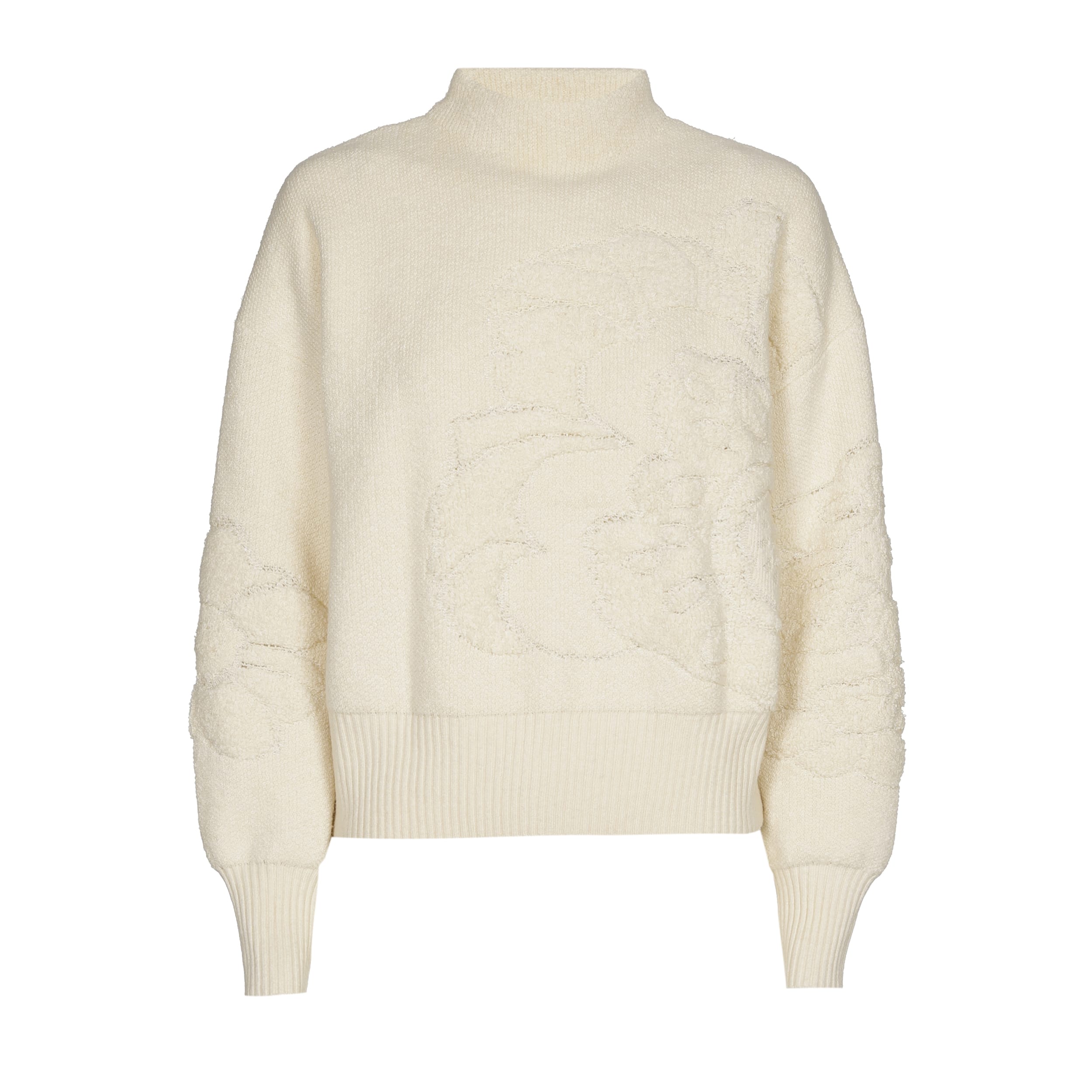 Trui van Caroline Biss in een bloemreliëf met lange mouwen, opstaande kraag en ribgebreide boorden. Materiaal: Katoen 51%| polyester 37%| wol 5%| polyamide 4%| elastan 3%