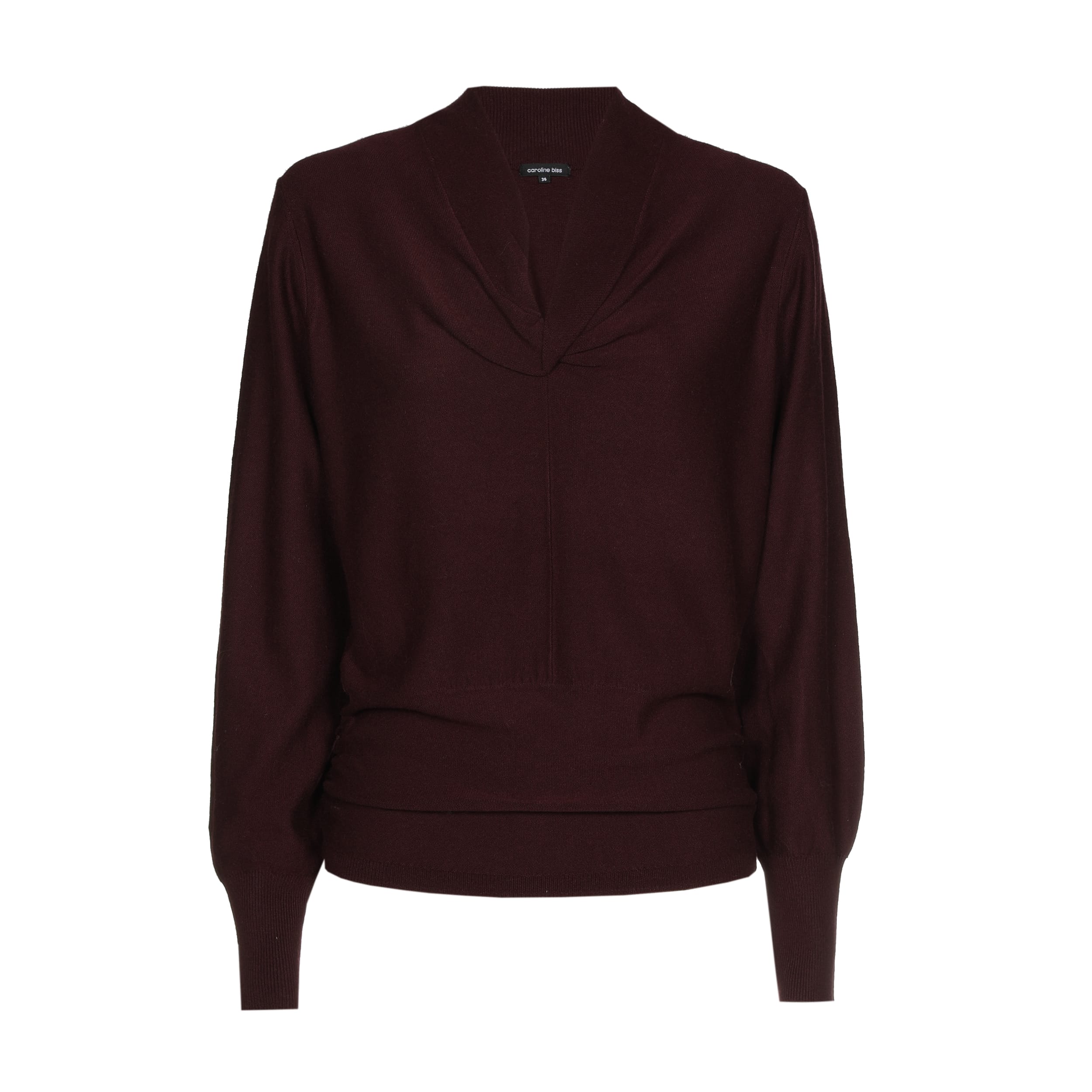 Fijngebreide trui van Caroline Biss met lange mouwen, gedrappeerde tailleband en licht opstaande kraag met V-hals. Materiaal: Viscose 47%| polyamide 35%| katoen 15%| kasjmier 3%