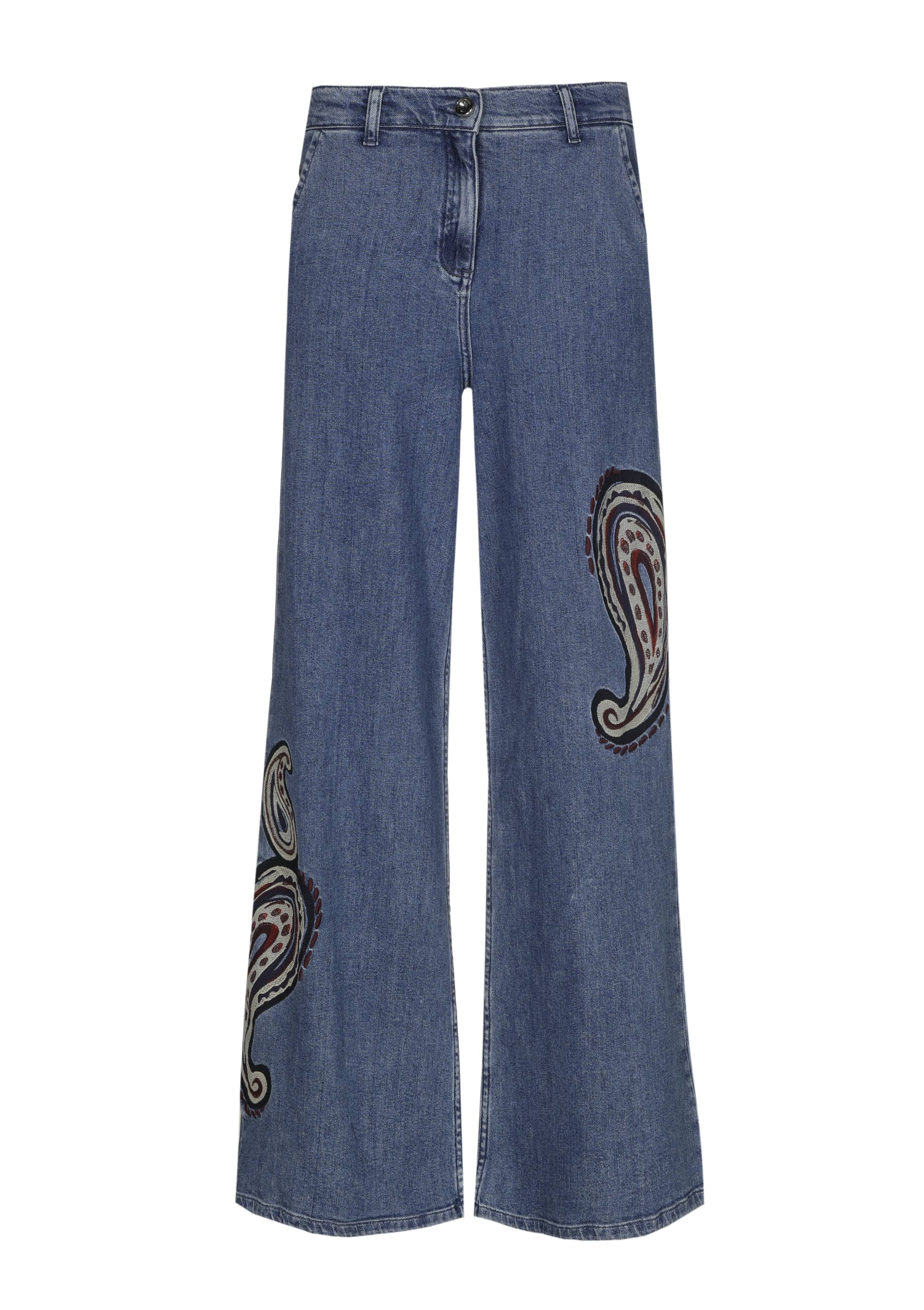 Jeans van Caroline Biss met wijde pijpen voorzien van broderie detail, knoop- en ritssluiting, steekzakken en opgestikte achterzakken. Materiaal: Katoen 99%| elastan 1%