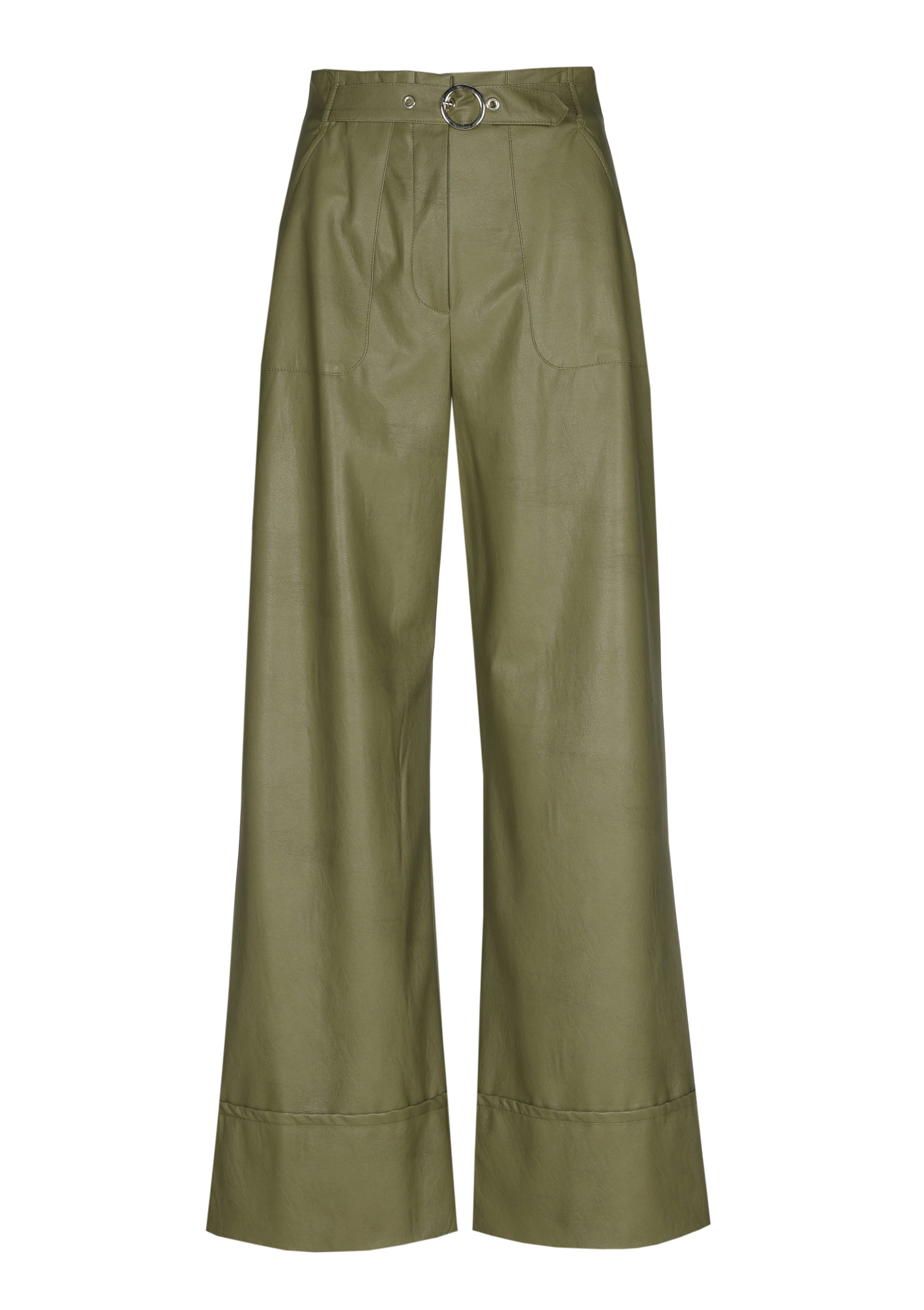 Enkellange glanzende broek van Caroline Biss met wijde pijpen voorzien van brede zoom, verborgen knoop-en ritssluiting, steekzakken en een ceintuur in de taille.