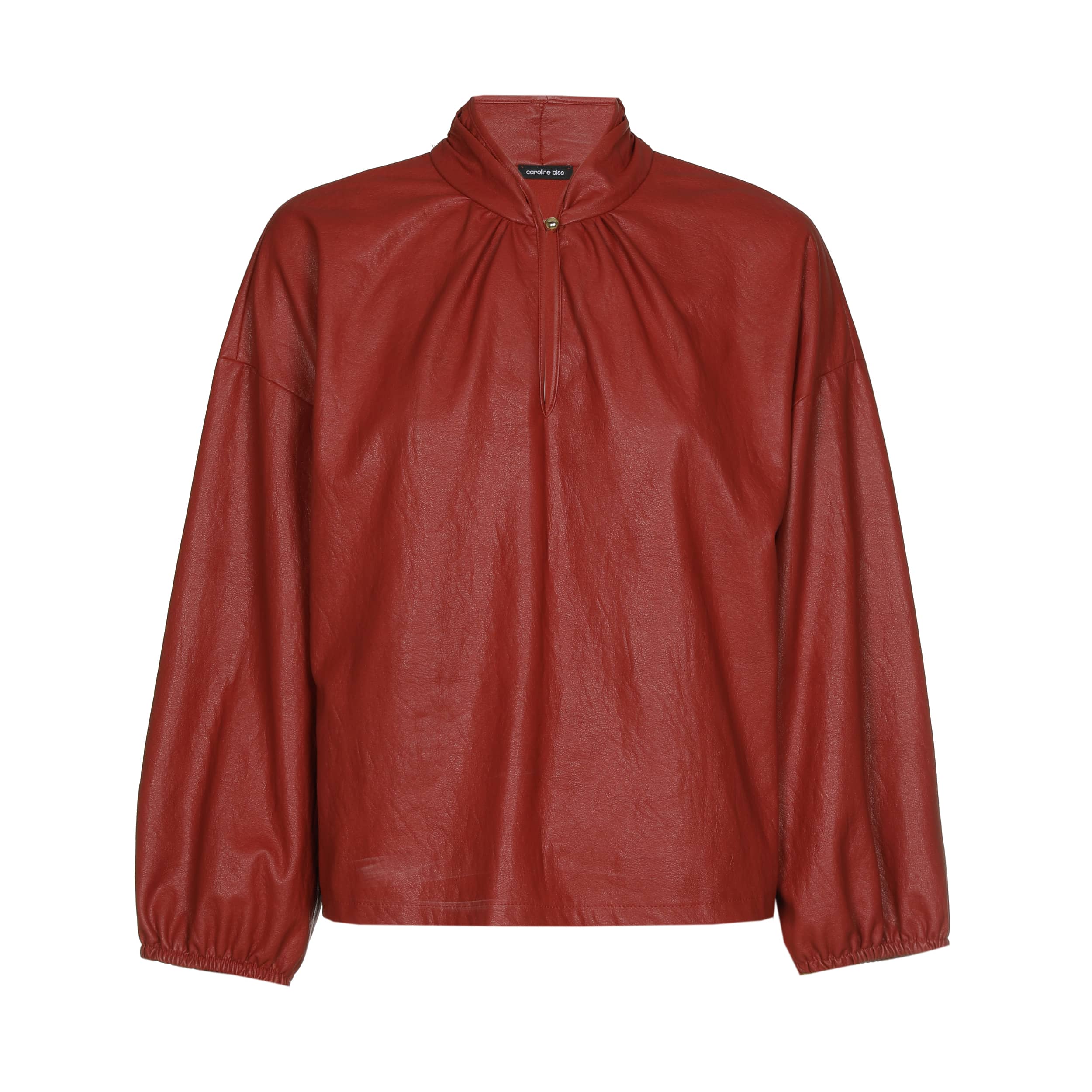 Imitatie leren top van Caroline Biss met driekwart pofmouwen en een opstaande kraag voorzien van split en knoopsluiting.