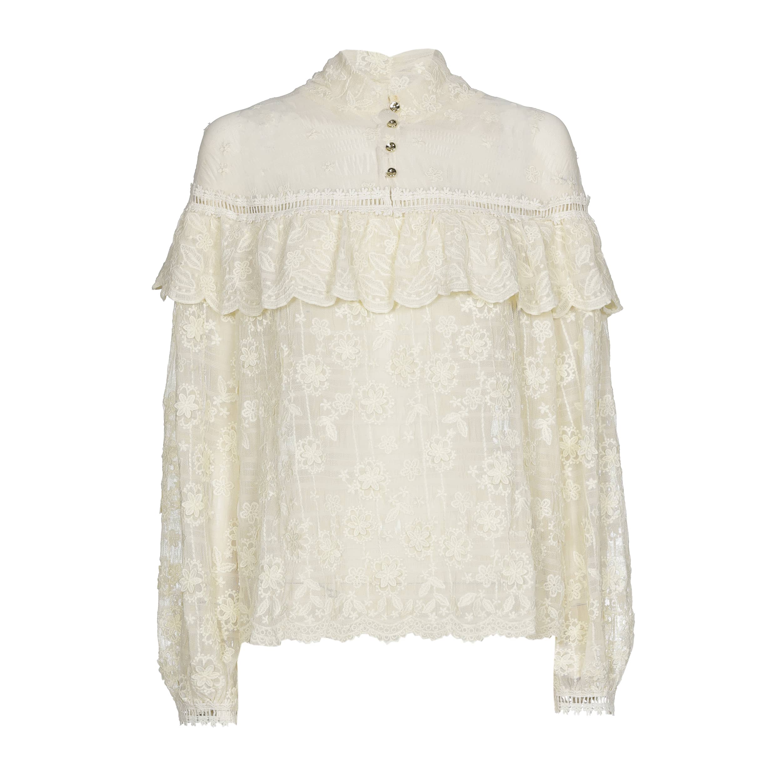 Kanten blouse van Caroline Biss met lange pofmouwen, opstaande kraag voorzien van korte knoopsluiting en een ruche langs de schouders.
