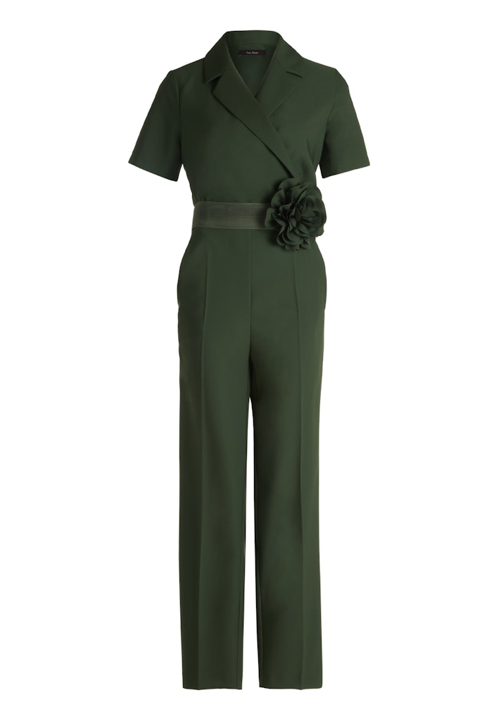 Jumpsuit van Vera Mont met korte mouwen, reverskraag voorzien van overslag, steekzakken, twee paspelzakken aan de achterzijde en een ceintuur met een grote bloem decoratie.
