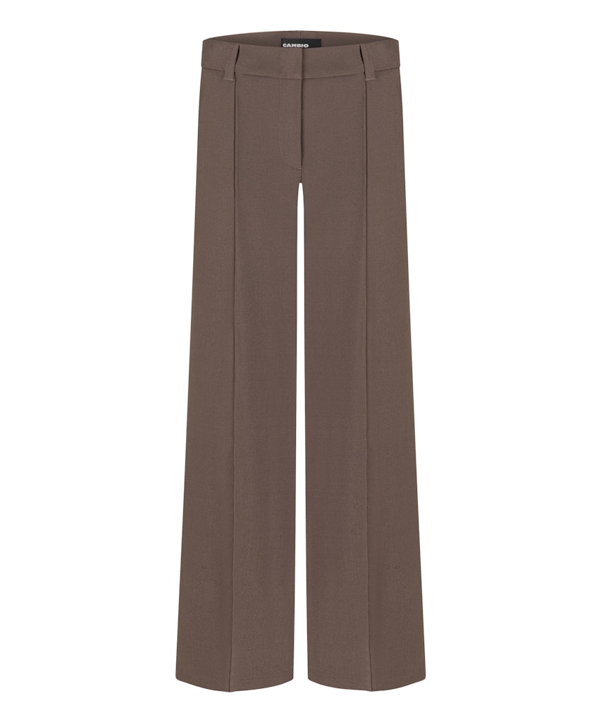 Broek van Cambio met wijde pijpen, verborgen knoop- en ritssluiting, steekzakken, pintucknaad aan de voorzijde en twee paspelzakken aan de achterzijde.