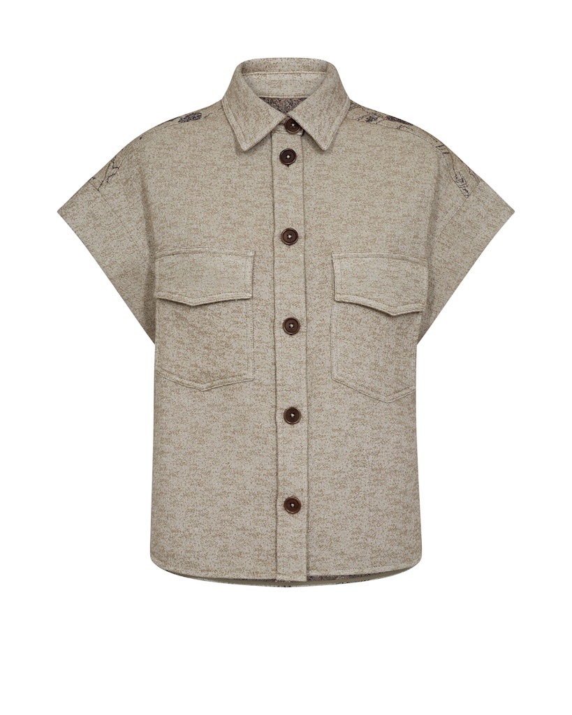 Gilet van Mos Mosh in een all-over dessin met een print aan de achterzijde, korte aangeknipte mouwen, kraag, knoopsluiting en twee opgestikte klepzakken.