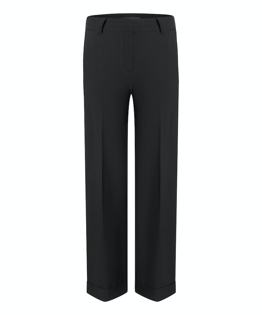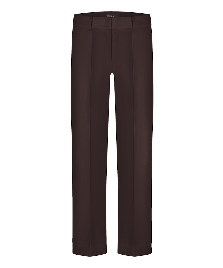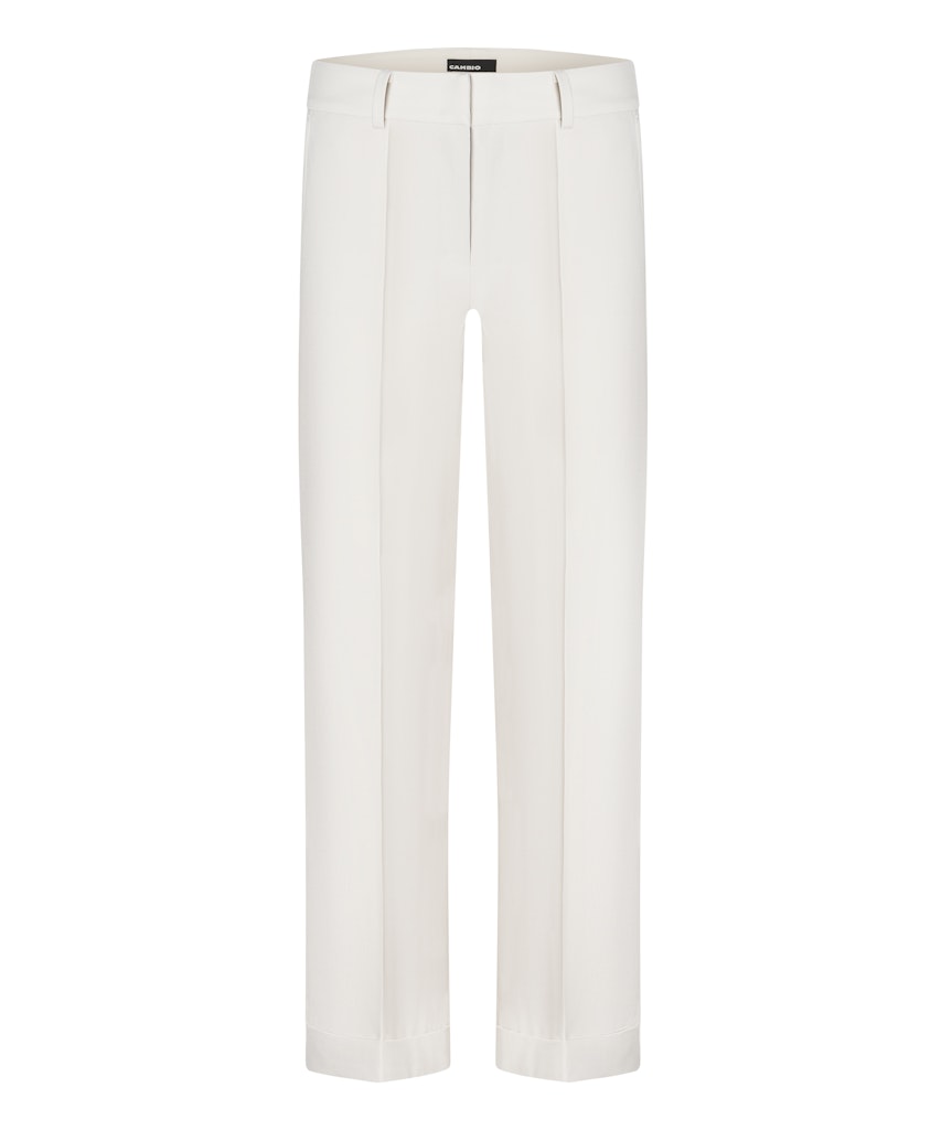 Broek van Cambio met rechte pijpen, verborgen knoop- en ritssluiting, steekzakken, twee paspelzakken aan de achterzijde en een pintucknaad aan de voorzijde.