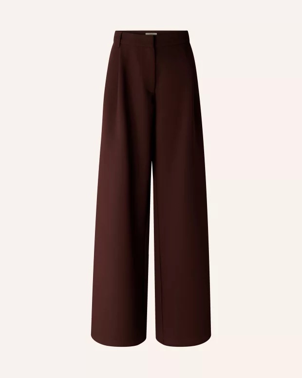 Broek van Sessun met wijde pijpen, bandplooien, verborgen knoop- en ritssluiting, steekzakken en twee paspelzakken aan de achterzijde.