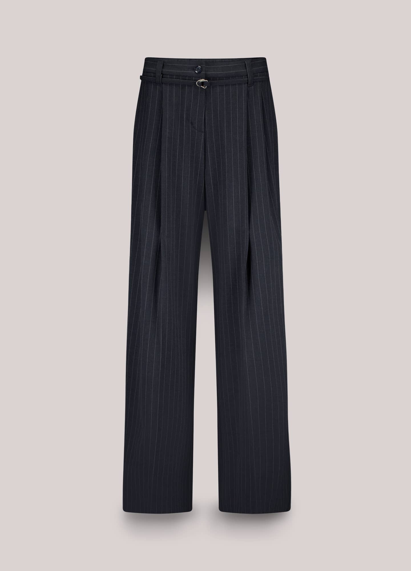 Krijtstreep broek van Summum met wijde pijpen, knoop- en ritssluiting, bandplooien, steekzakken, twee klepzakken en een elastische tailleband aan de achterzijde, en een stoffen ceintuur in de taille.