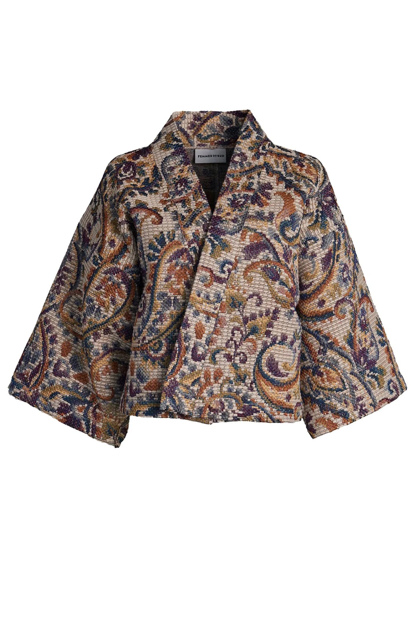 Openvallend jacquard jacket van Femmes du Sud in een all-over dessin met driekwart wijde mouwen.