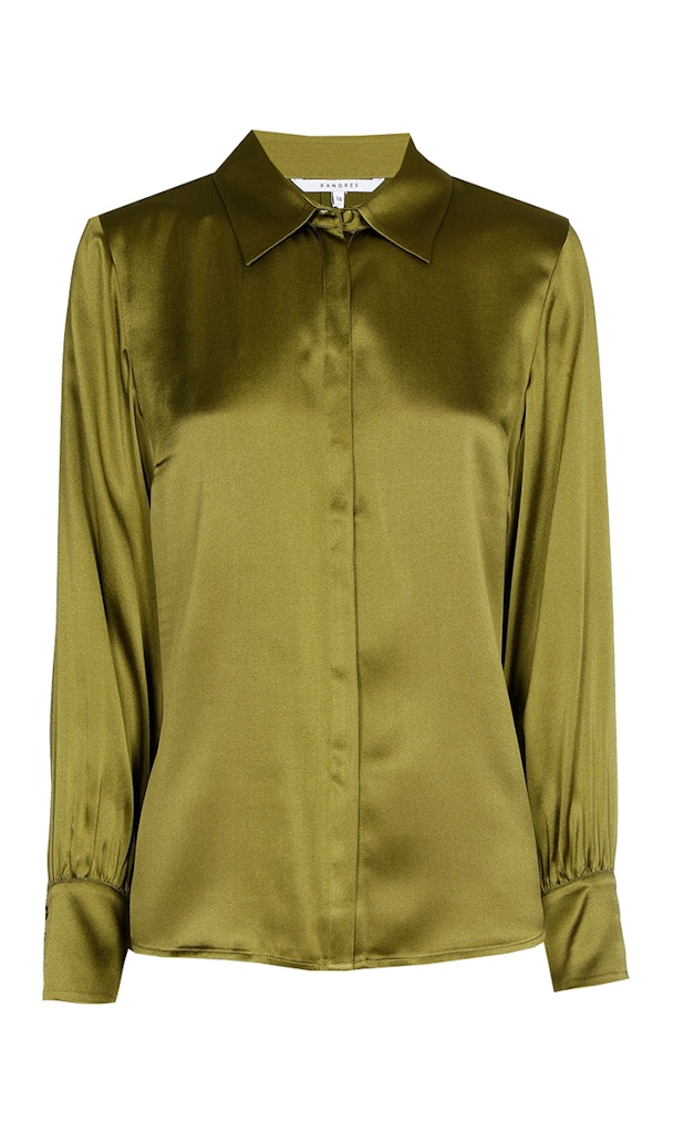 Satijnen blouse van Xandres met lange mouwen voorzien van brede manchetten, kraag en een verborgen knoopsluiting. Materiaal: Zijde 52%| viscose 40%| elastan 8%