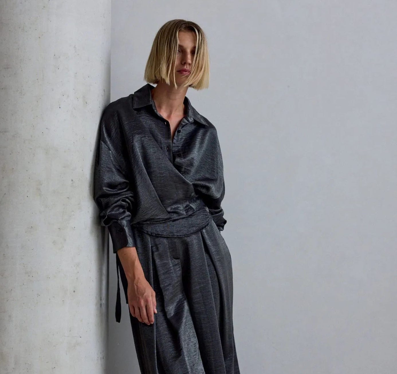 Satijnen wikkelblouse van Femmes du Sud met lange pofmouwen, kraag, V-hals voorzien van overslag en een striksluiting in de taille. Materiaal: Viscose 86%| polyamide 14%