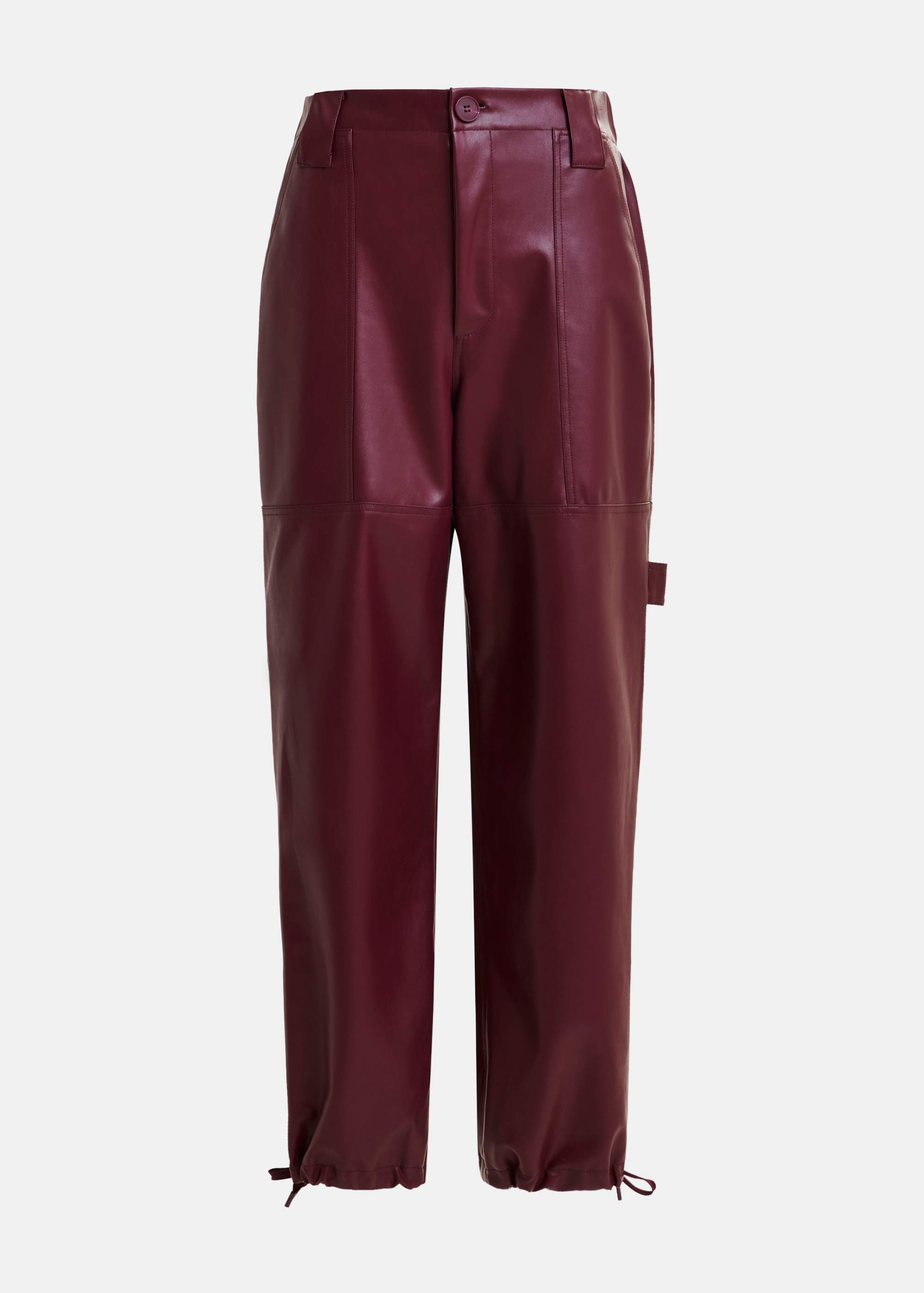 Imitatie leren broek van Essentiel Antwerp met een knoop- en ritssluiting, opgestikte voor- en achterzakken, hamerlus en wijde pijpen voorzien van elastische zomen. Materiaal: Polyurethaan 100%