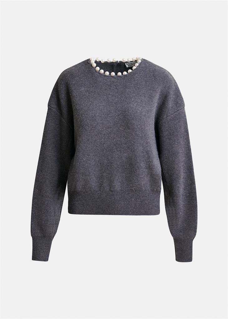 Trui van Essentiel Antwerp met lange pofmouwen, verlaagde schoudernaden, ronde hals versierd met parels en ribgebreide boorden.