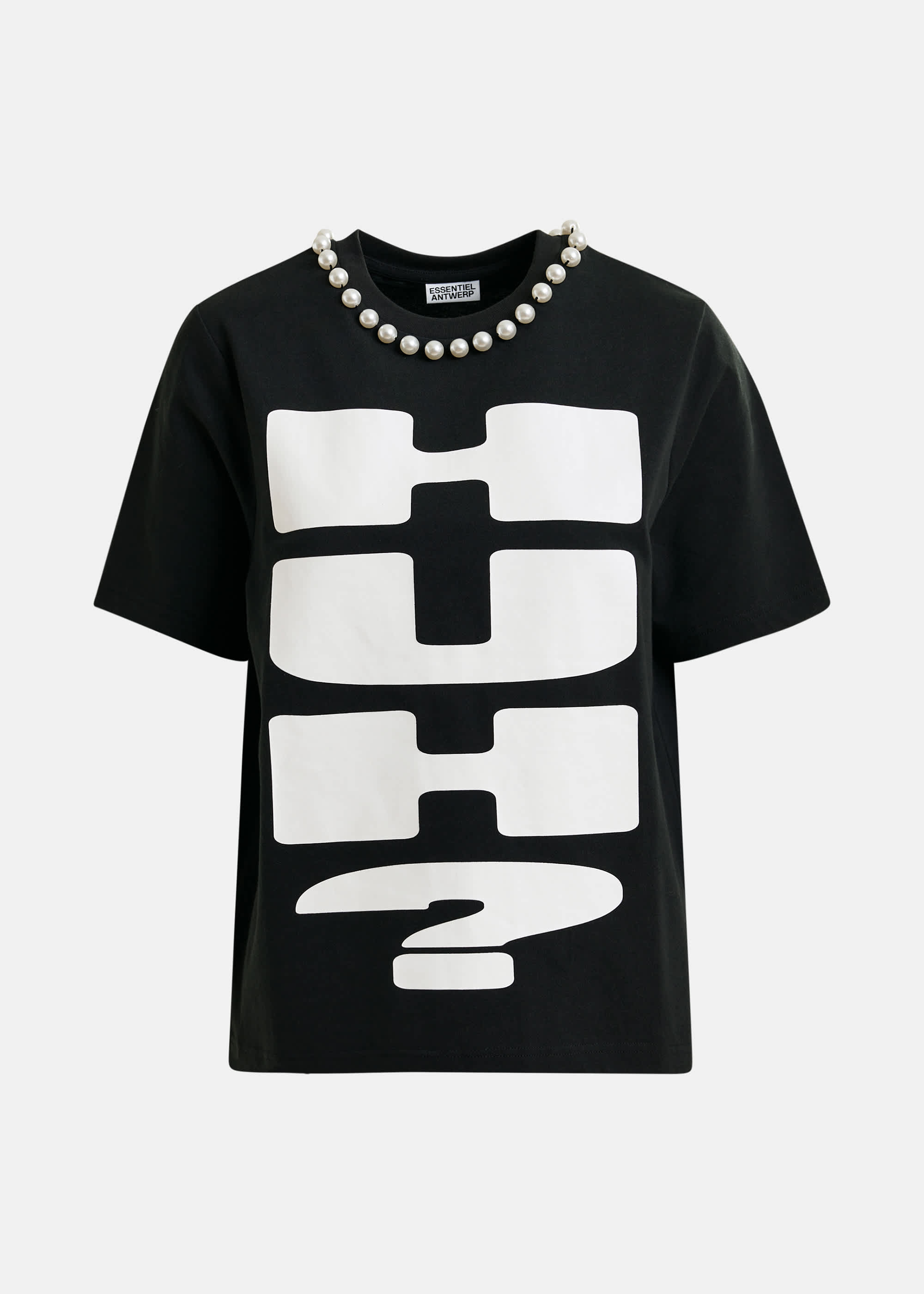 T-shirt van Essentiel Antwerp met korte mouwen, ronde hals versierd met kralen en een grote print aan de voorzijde. Materiaal: Katoen 100%